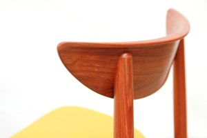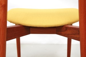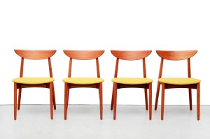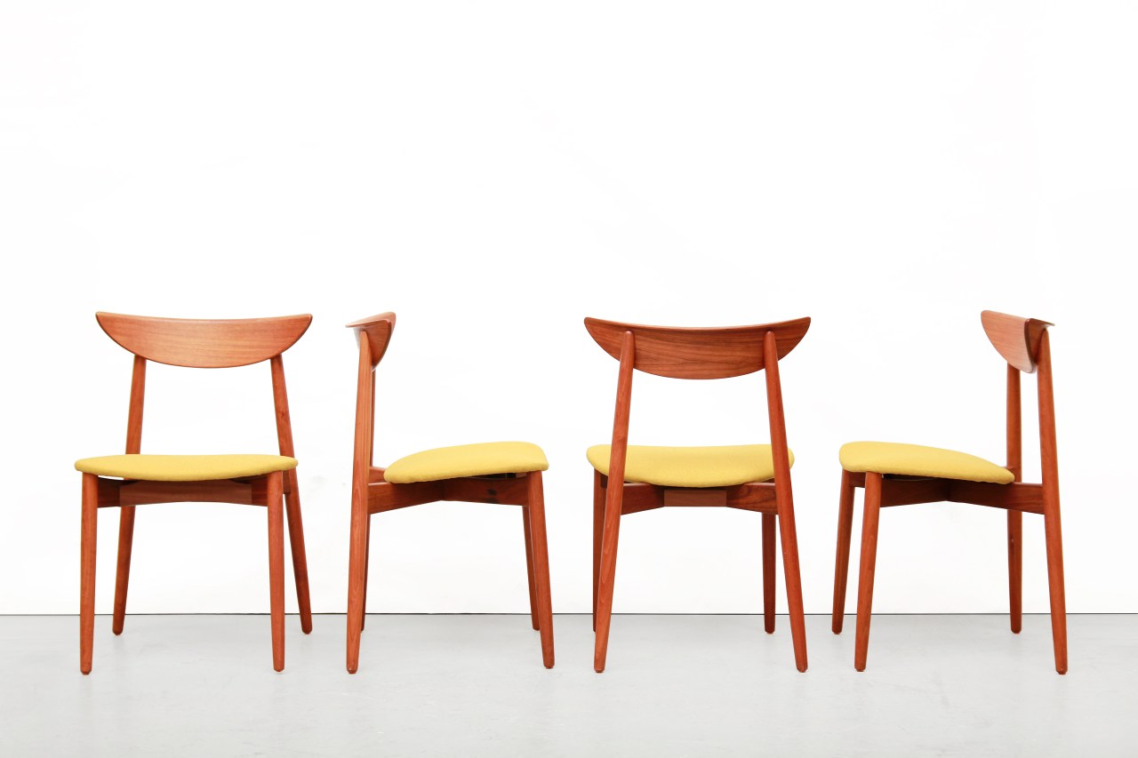 Omschrijving: Mooie set van 4 Harry Ostergaard eetkamerstoelen geproduceerd door Randers Mobelfabrik uit Denemarken. Deze luchtig vormgegeven stoelen zijn gemaakt van massief teakhout met prachtige ambachtelijke houtverbindingen. Deze stoelen zijn van hoge kwaliteit. Ook de organisch vormgegeven rugleuning is een plaatje an sich.De zittingen zijn gestoffeerd met een mooie kleurrijke oker gele meubelstof, zodat de set echt een eye catcher wordt in uw interieur. De stoelen zijn 76 cm hoog, 50 cm breed, 47 cm diep en hebben een zithoogte van 45 cm.