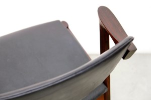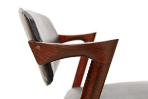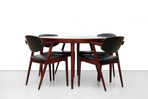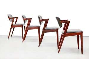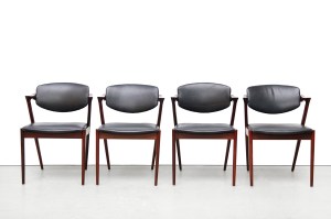Omschrijving: Een prachtige set van 4 Deens design stoelen ontworpen door Kai Kristiansen voor SVA Mobler. De stoelen hebben modelnaam nummer 42 en zijn gemaakt van massief palissander hout en zijn bekleed in stevig zwart leer. De geweldige organische vormen zorgen voor een indrukwekkend silhouet. Maar het zijn niet alleen mooie stoelen, ze zitten ook heerlijk. De rugleuning is zo ontworpen dat hij mee beweegt, welke houding je ook aanneemt. Er is niet alleen rekening gehouden met comfort en hoe de stoelen eruit zien, maar je vindt in deze stoelen ook een hoop ambacht terug. Mooie houtverbindingen, prachtig afgewerkt. Zo liggen de zittingen bijvoorbeeld los in de stoel zodat er geen schroeven gebruikt hoeven te worden. De Kai Kristiansen stoelen zijn 55 cm breed, 53 cm diep, 77 cm hoog en de zithoogte is 45 cm.