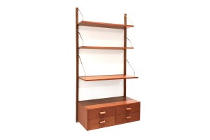 Omschrijving: Mooi klein maar fijn wandsysteem gemaakt van teak uit Denemarken. Deze wandkast bestaat uit 2 houten staanders 3 planken en een ladenkast. Het is niet alleen een mooi object in huis, maar ook nog eens heel functioneel. Gebruik deze kast om dingen in op te bergen, of gebruik hem als werkplek. Dit wandsysteem is 77 cm breed, 36 cm diep en de staanders zijn 150 cm hoog.