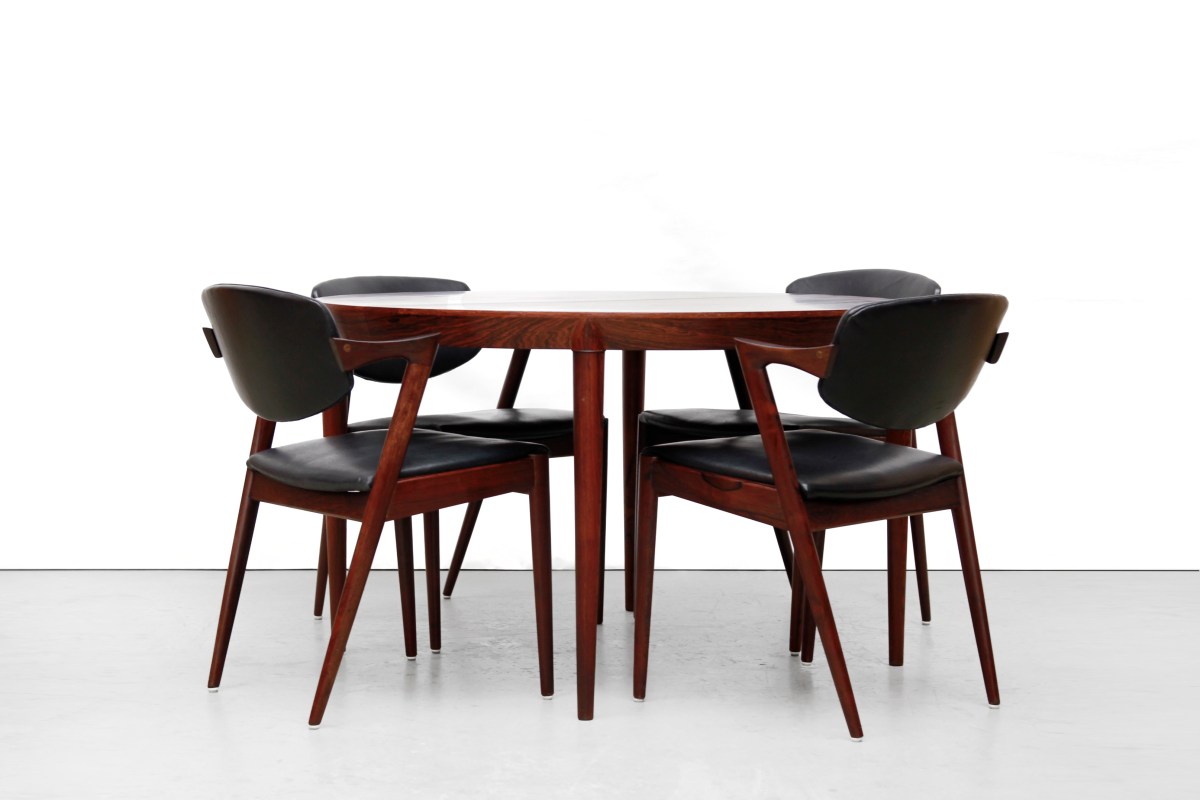 Complete dining Set van 4 Palissander model 42 stoelen in zwart leer van Kai Kristiansen met Rosewood round table VAN ONS Gepubliceerd 23 april 2018 at 3228 × 2152 in Teakhouten wandsysteem in de stijl van Poul Cadovius ← Vorige Volgende →