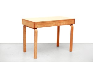Omschrijving: Alvar Aalto wordt vandaag de dag erkend als een van de grootste meesters van de moderne architectuur en is een van de oprichters van Artek. Dit bureau is een zeer zeldzaam vooroorlogs (1935-1940) bureau ontworpen door Aalto en vervaardigd door Artek in Finland. Het bureau is gemaakt van massief berkenhout en berkenfineer. Dit stuk beschikt over de iconische L-vormige gebogen houten poten welke Aalto bij meerdere ontwerpen heeft gebruikt. De oorsprong van deze schrijftafel is even zo bijzonder. In de jaren 50 was er een radarstation in Noordwijk welke in het geheim afluisterapparatuur maakte voor de Amerikaanse CIA om de Russen te bespioneren tijdens de Koude Oorlog. Dit gebeurde onder de codenaam ‘project armchair’. We hebben dit bureau gekocht van de man die nu woont in hetzelfde huis waar hij, als een kleine jongen, koffers voor de uitrusting maakte aan dit bureau. Het bureau is gestempeld met: AALTO DESIGN – MADE IN FINLAND en is 100 cm breed, 52 cm diep en 73,5 cm hoog.