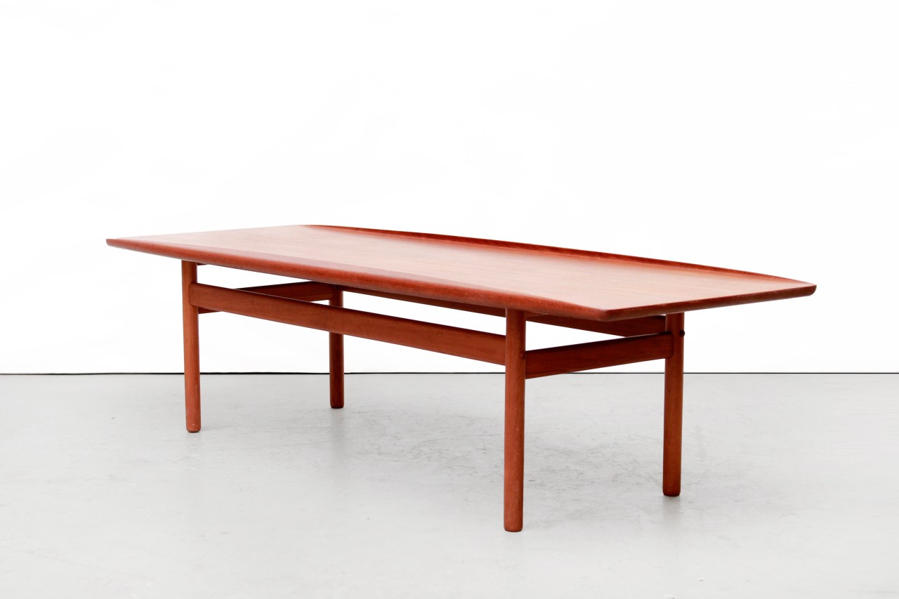 Omschrijving: Zeldzame salontafel ontworpen door bekende Deense ontwerpster Grete Jalk uit Denemarken. Deze salontafel is vrij groot en heeft een mooie ronding in het blad en een opstaande rand. Dit model wordt dan ook wel eens de Surfboard table genoemd. Deze grote salontafel zou eventueel ook als bankje gebruikt kunnen worden. De afmeting is 163 cm breed, bij 60 cm diep en 42 cm hoog.