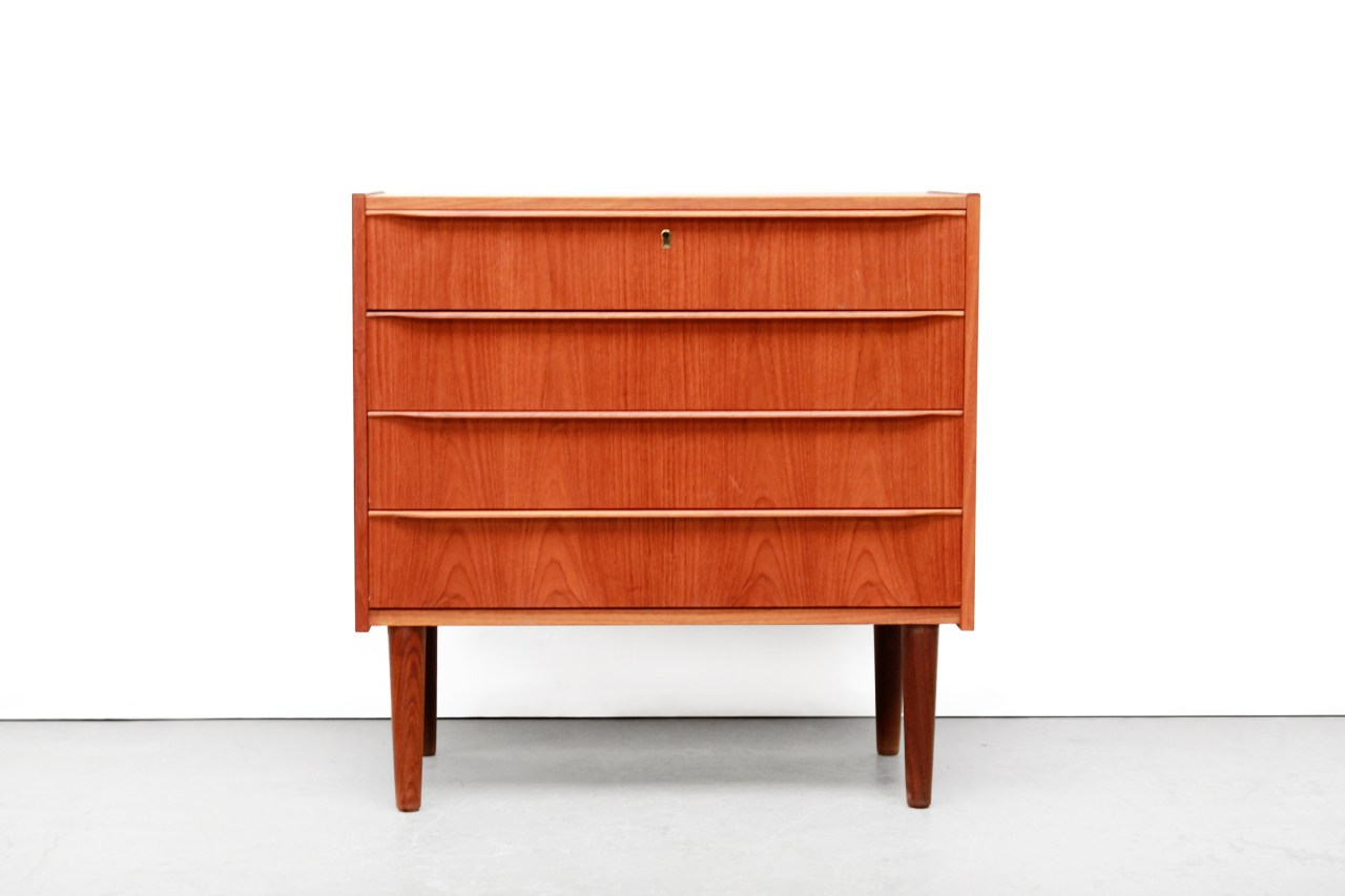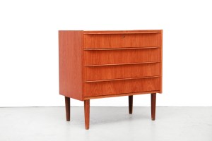 Omschrijving: Mooie Deens design ladekast met 4 lades. Uitgevoerd in teak fineer en massief teakhouten greepjes en pootjes. De vormgeving van het kastje is lekker modernistisch, recht en zonder poespas. Dit maakt het kastje gemaakt van kostbaar teakhout een tijdloos model. Fijn formaat die je op meerdere plekken in het huis kwijt kunt en waar je veel in op kunt bergen. Deze kast is 76 cm breed, 42 cm diep en 76,5 cm hoog.
