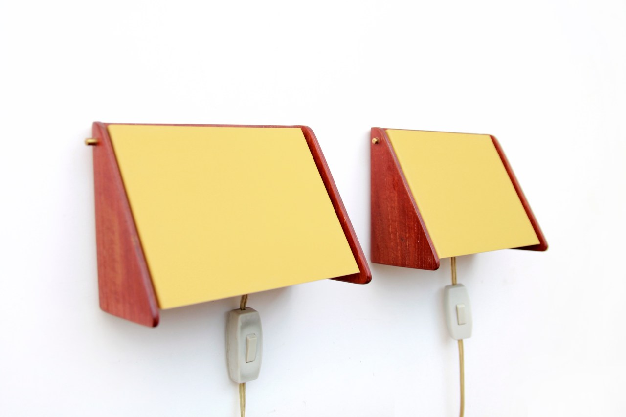Omschrijving: Set van twee prachtige bedlampjes uit Denemarken. Gemaakt van gebogen teakhouten plywood met zacht geel gelakte metalen kapjes. De plywood lampjes doen erg denken aan de zeldzame plywood butterfly shelves van Poul Cadovius. Deze erg mooi ontworpen set komt niet veel voor en zal een eye catcher zijn in elke slaapkamer. De afmetingen zijn 18, 5 cm x 17, 5 cm x 8 cm.