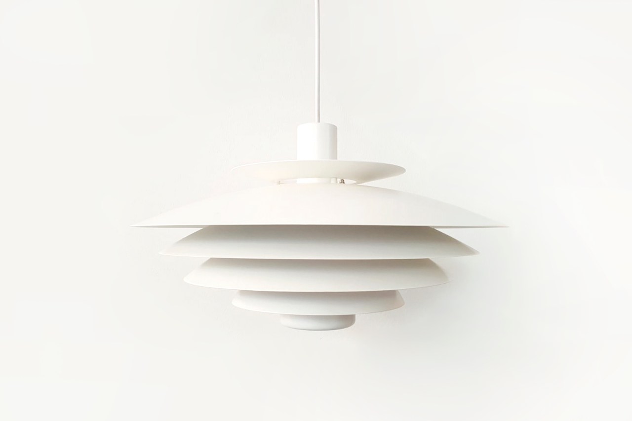 Omschrijving: Mooie vintage Deens design hanglamp in de stijl van Poul Henningsen en Louis Poulsen. Dit model is van de Deense fabrikant Form light en zes lagen. De lamp is is 30 cm hoog en heeft een diameter van 46 cm. We hebben twee lampen beschikbaar welke samen ook erg geschikt zijn voor boven een langwerpige eetkamertafel.
