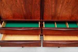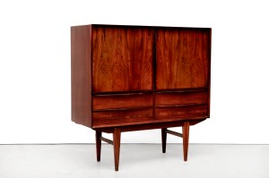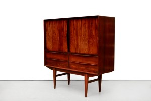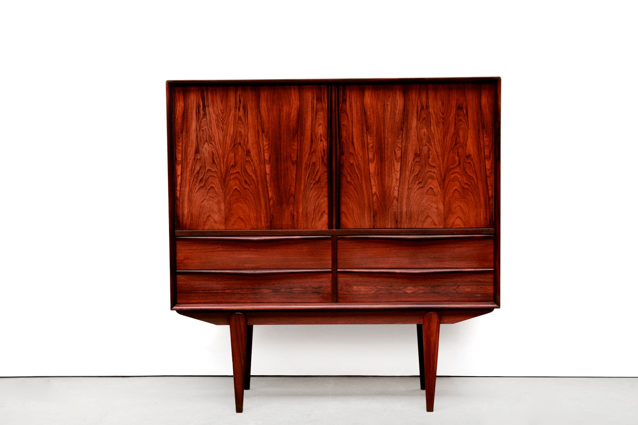 Omschrijving: Prachtige Deens design kast ontworpen door E.W Bach uit Denemarken. Dit highboard heeft twee deuren met daarachter een plank en vier lades. Hij is uitgevoerd in Rio Palissander fineer en staat op taps toe lopende pootjes. Door het palissander is deze kast donker van kleur met een prachtige tekening in het hout. Deze palissander kast is 115 cm breed, 42 cm diep en 118 cm hoog.