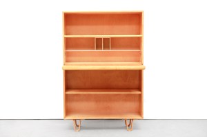 Omschrijving: Zeer mooie secretaire van Cees Braakman uit de bekende Berkenserie van Pastoe. De gebogen berkenhouten poten zijn kenmerkend voor deze serie. Deze prachtige kast kan gebruikt worden om in op te bergen, maar door de klep met het handige opbergvak is deze kast ook zeer goed te gebruiken als bureau. Aan de nieuwe werkplek die de klep heeft gecreëerd, kan namelijk makkelijk gewerkt worden met een laptop. Zeer handig voor mensen die klein behuisd zijn. De kast is: 134 cm hoog, 88 cm breed en 30cm diep.