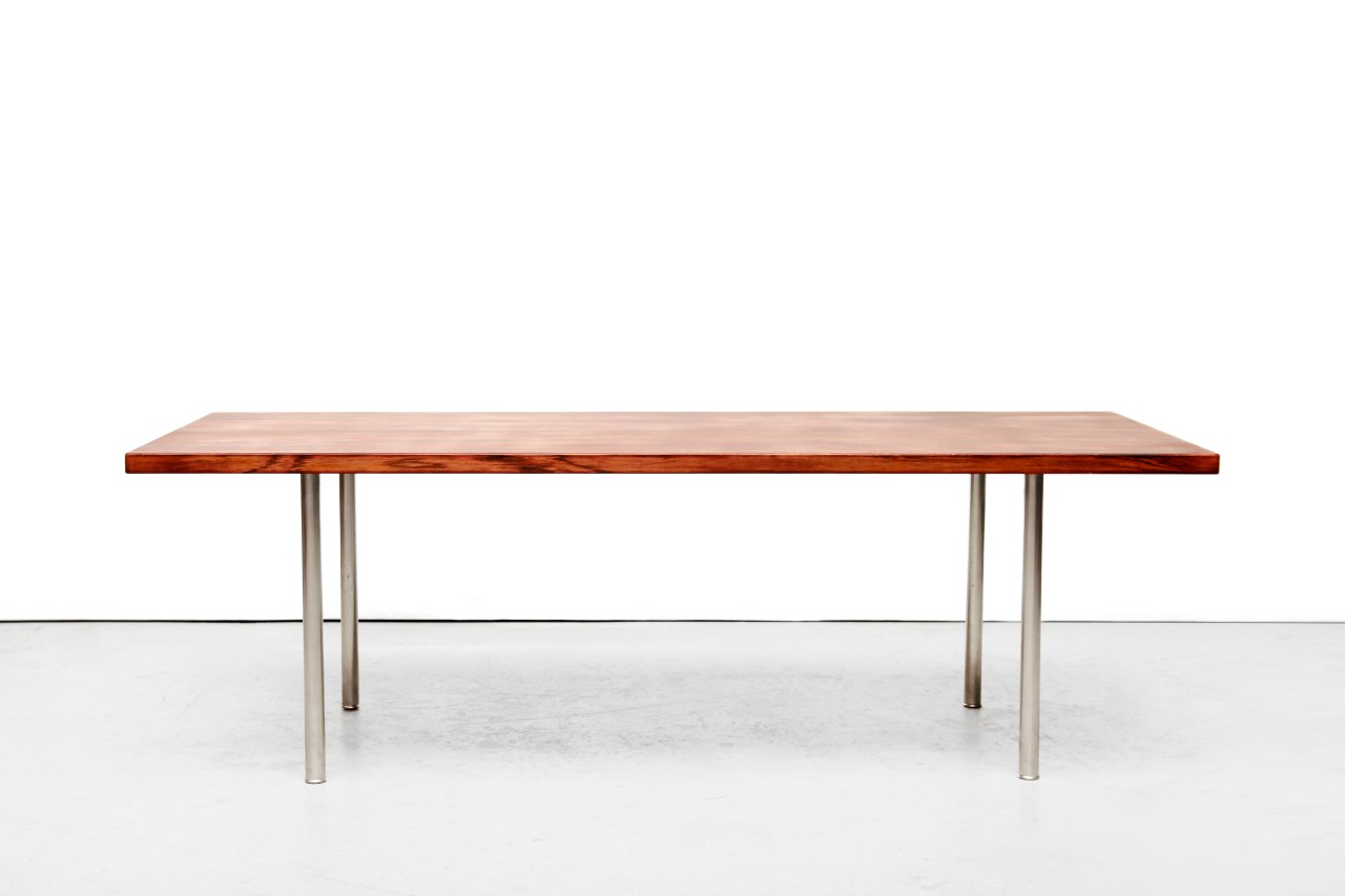 Omschrijving: Stijlvolle Palissander houten salontafel ontworpen door bekende Deense ontwerper Hans Wegner en geproduceerd door Andreas Tuck. Deze tafel is gemaakt eind jaren 50 en is ingelegd met prachtig Rio palissander fineer. De ronde chromen poten zijn mooi verzonken in het tafelblad gemonteerd. De tafel is 150 cm breed, 62 cm diep en 48,5 cm hoog.