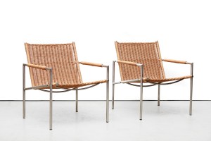 Omschrijving: Prachtige set van twee SZ01 fauteuils ontworpen door Martin Visser voor Spectrum. Deze fauteuil is ontworpen in 1960 en sindsdien in productie geweest. Wij hebben vernomen dat deze fauteuils uit de eind jaren 70 / begin jaren 80 komen. De afmetingen van het geborsteld verchroomd stalen frame hebben nog de ‘ouderwetse’ hoogte ten opzichte van de modellen vanaf de jaren 90, die drie centimeter hoger zijn. De stoelen zijn 60 cm breed, 65 cm diep en 71 cm hoog. De zithoogte van de fauteuils is 38 cm. Bij voorkeur worden de fauteuils als complete set verkocht.