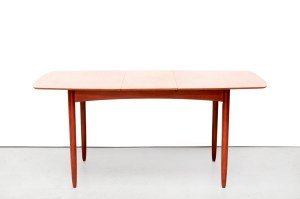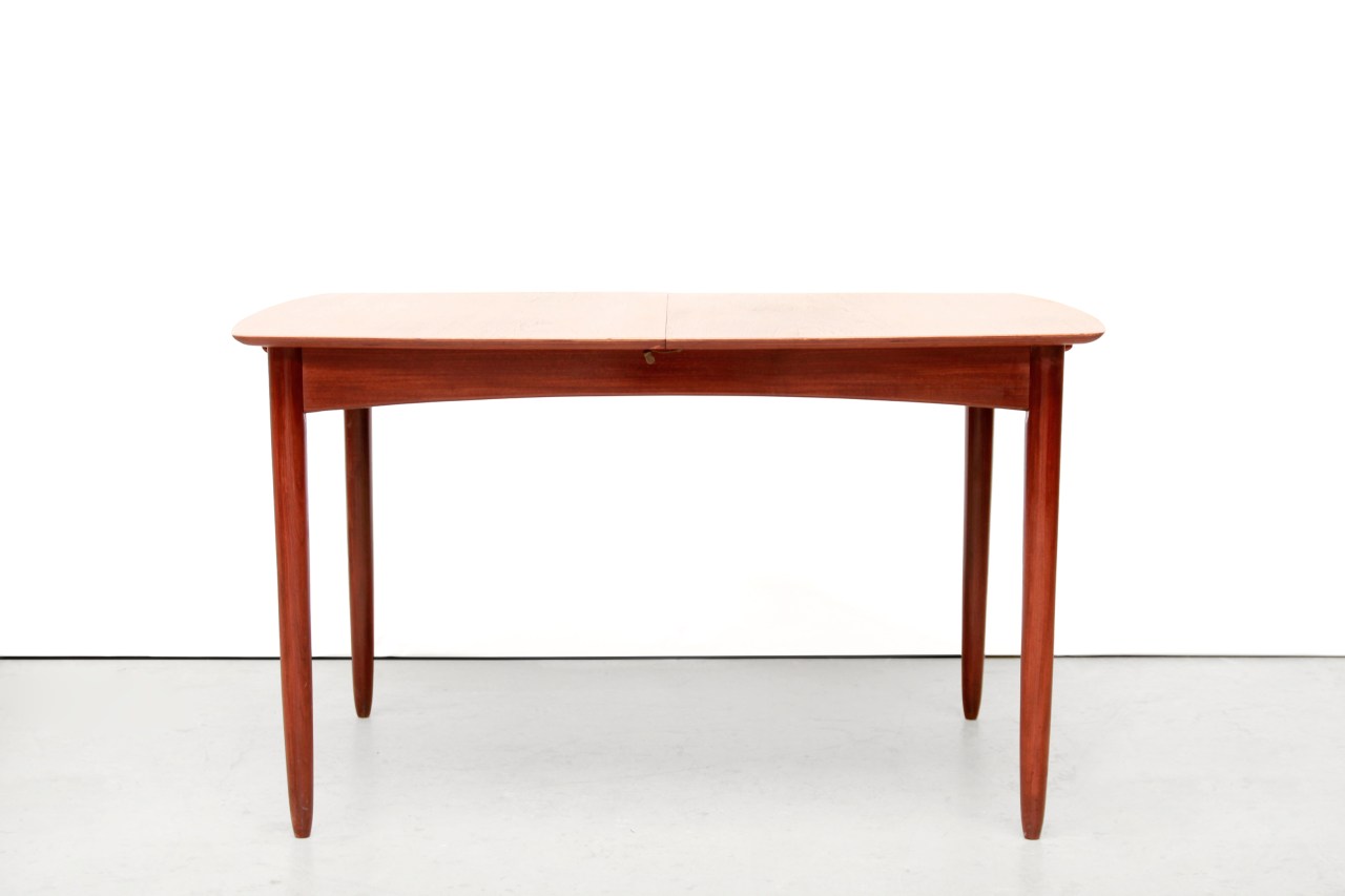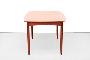 Omschrijving: Mooi vormgegeven teak houten eetkamertafel toegeschreven aan Cees Braakman voor Pastoe. De tafel is niet rechthoekig, maar ook niet rond. Alle zijdes hebben een prachtige subtiele ronding. Het blad loopt schuin af waardoor deze slanker lijkt dan wat hij daadwerkelijk is. Deze tafel is uitschuifbaar en daardoor met 38 cm verlengbaar. Het blad is eenvoudig en onzichtbaar onder het tafelblad op te bergen. De tafel is compleet uitgeschoven 165 cm lang en ingeschoven 127 cm, hij is 90 cm diep en 74 cm hoog.