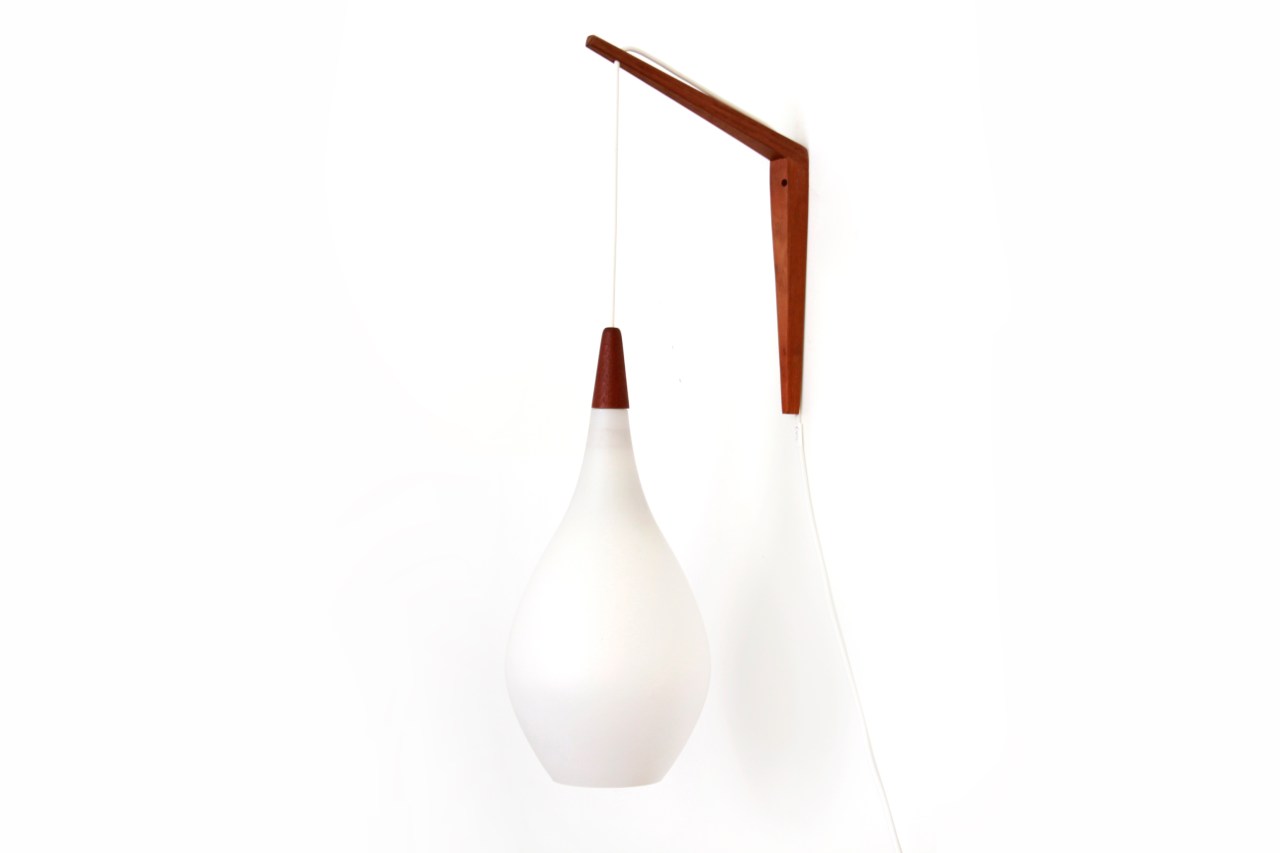 Omschrijving: Prachtig vormgegeven wandlamp van de Deense fabrikant Holmegaard. De opaal wit glazen kelk in druppelvorm met teakhouten detail hangt aan een teakhouten ophanging. De lamp is gemerkt met ‘Made in Denmark’. Het melkwitte glas heeft een diameter van 18 cm en een hoogte van 45 cm inclusief teak kapje.