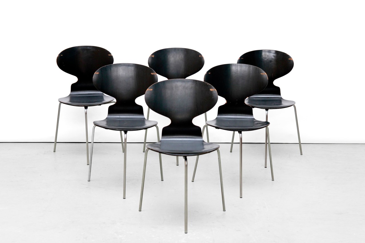 Omschrijving: Zes prachtige stoelen ontworpen door Arne Jacobsen voor Fritz Hansen, Denemarken. De officiële naam van de stoelen is ‘stoel 3100’, maar ze worden door hun vorm ook wel ‘de mier’ genoemd. Bijzonder aan deze stoelen zijn de onderstellen met drie poten, tegenwoordig worden deze modellen alleen nog met vier poten gemaakt.