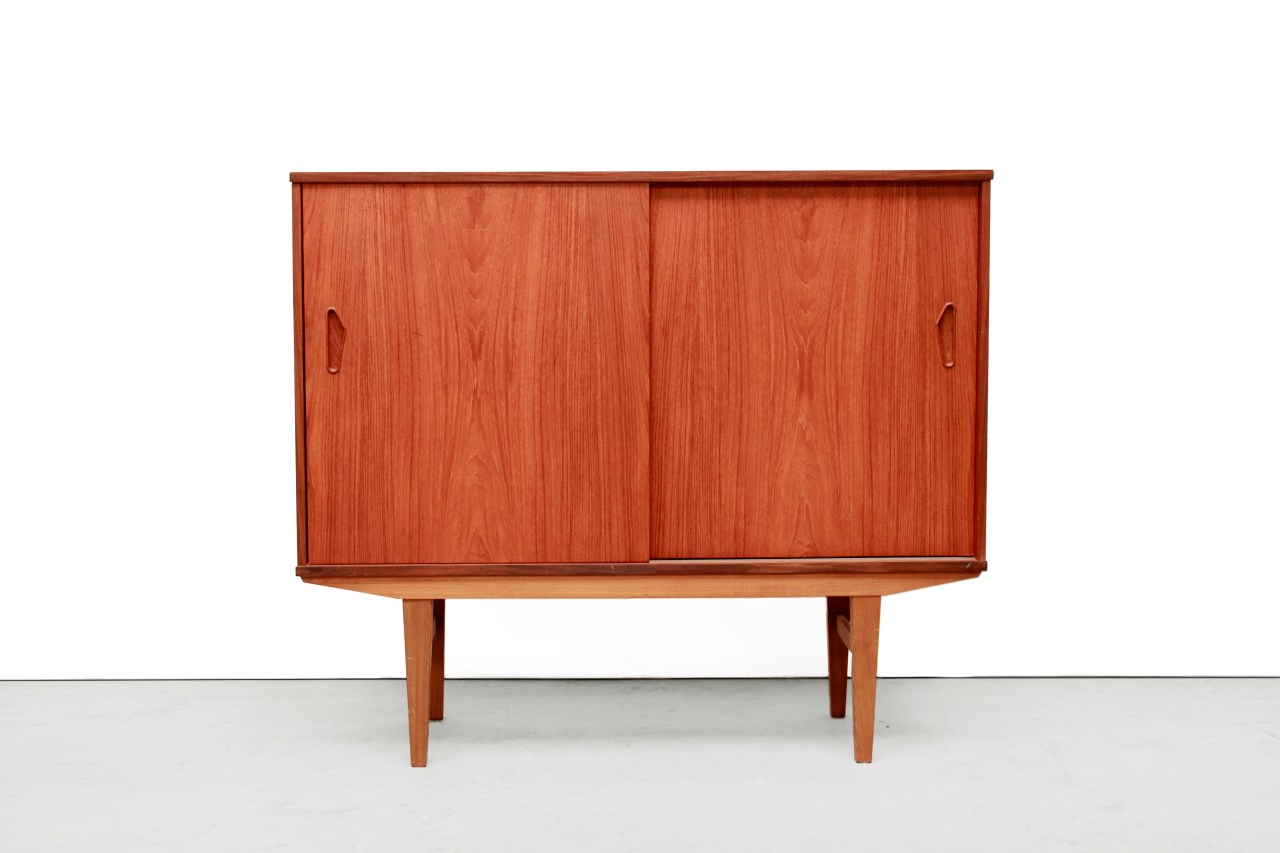 Omschrijving: Zeer leuk formaat teakhouten Deens design highboard. Niet te klein en niet te groot. Gemaakt van een combinatie van massief teakhout en teak fineer. De kast heeft twee schuifdeuren met achter de eerste deur twee planken en achter de tweede deur een plank met een spiegel en daaronder vier lades. De afmeting van het Deense highboard is 128 cm breed, 43 cm diep en 111 cm hoog.