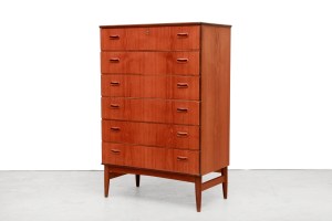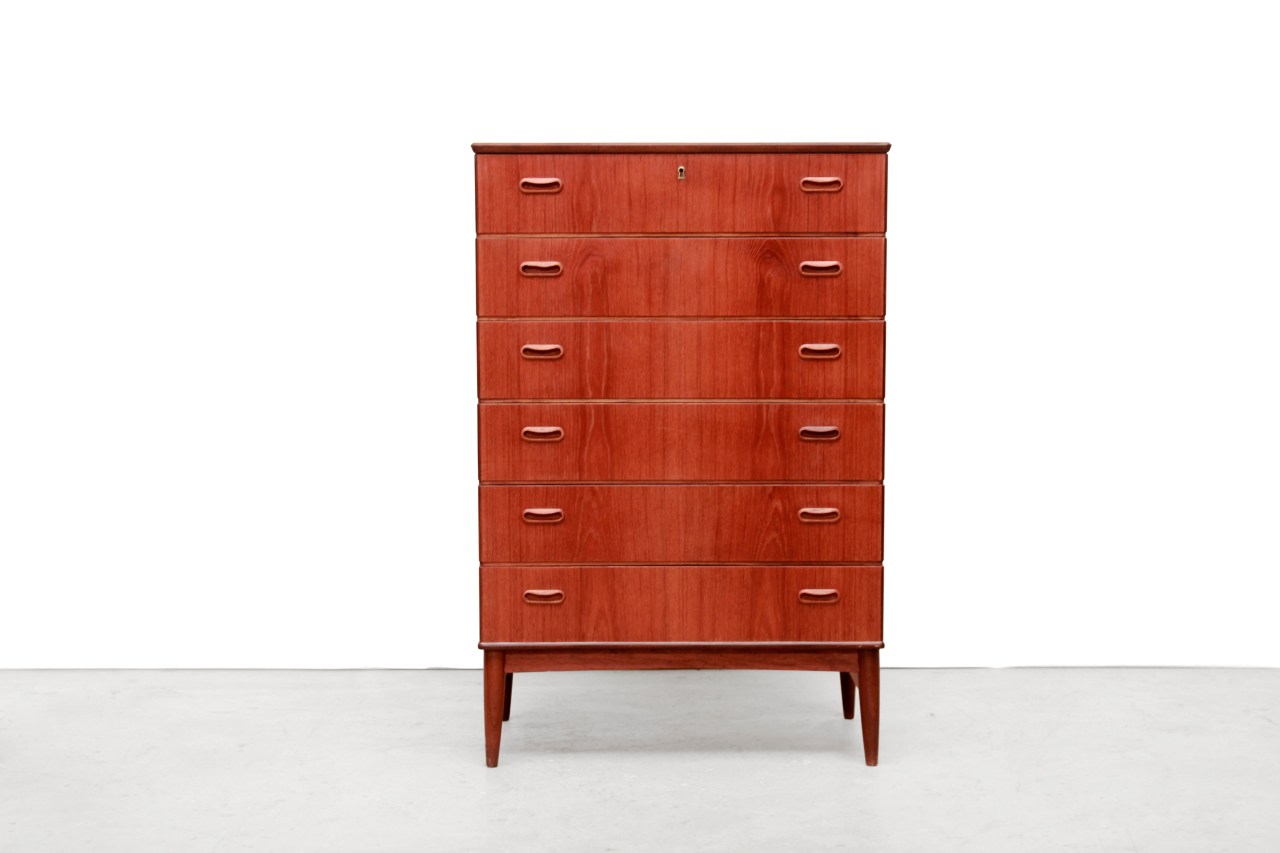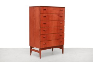 Omschrijving: Vintage Deens design ladenkast met 6 lades. Uitgevoerd in teak fineer en massief teak houten greepjes en pootjes. Deze kast heeft prachtige vrolijke diepliggende greepjes. Van deze hoogte vinden wij deze kasten niet vaak meer. Deze kast kan eventueel ook goed gebruikt worden als commode. Deze ladenkast is 75 cm breed, 43 cm diep en 114 cm hoog.