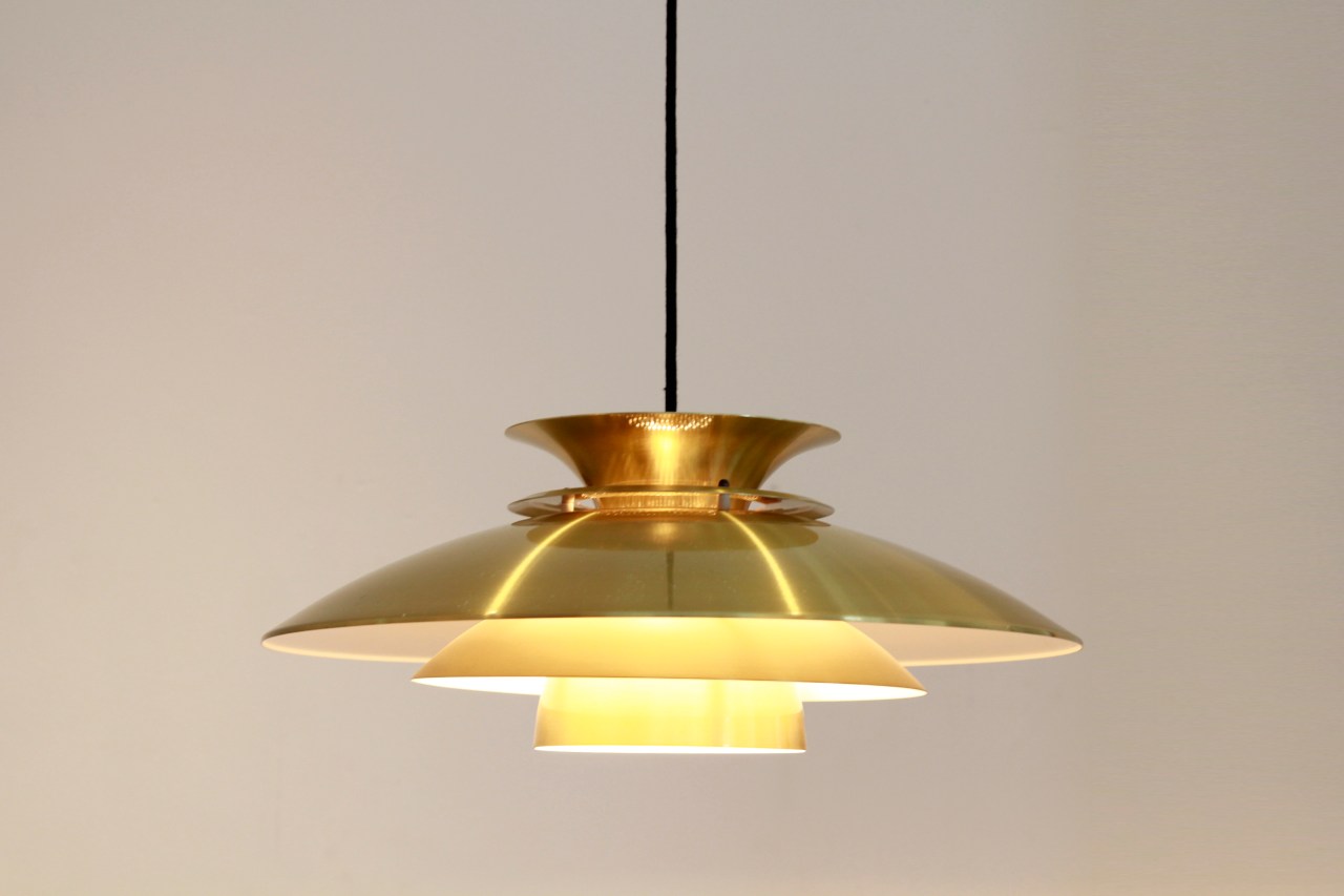 Omschrijving: Typisch Deense vintage hanglamp in Messing. Het ontwerp is in de stijl van Jo Hammerborg en heeft een strakke vormgeving.