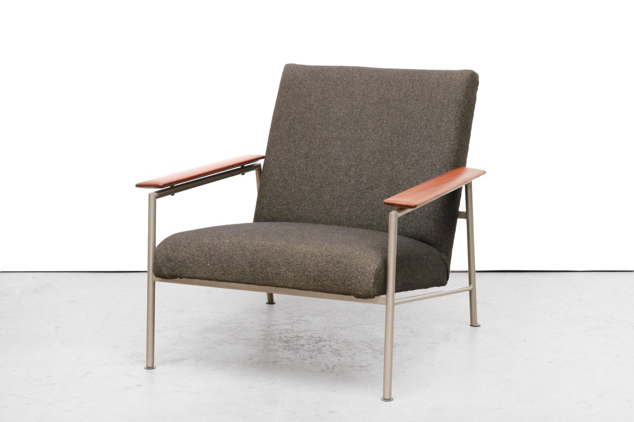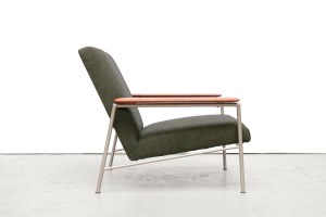 Omschrijving: Mooi strak ontwerp van de Nederlandse fabrikant Topform uit de jaren 60. Je kunt goed zien dat bij het ontwerpen van de fauteuil ook gekeken is naar de ontwerpen van de Nederlandse ontwerper Martin Visser. De fauteuil heeft een rond vernikkeld stalen frame, teak houten armleggers en een groen gestoffeerde zitting en rugleuning. Deze fauteuil is zoals we van het Nederlandse design uit deze periode gewend zijn minimalistisch en neemt optisch weinig ruimte in.