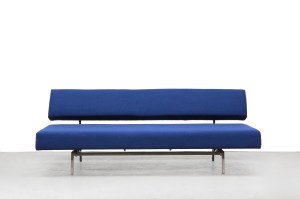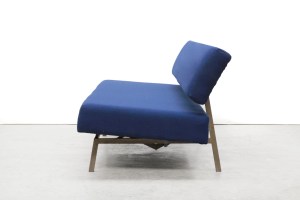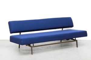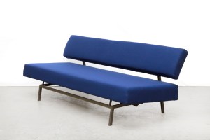 Omschrijving: Mooie minimalistische slaapbank in de stijl van Martin Visser. Deze slim ontworpen bank is in een handomdraai om te toveren naar een eenpersoons bed. Gestoffeerd in een blauwe wollen de Ploeg stof.