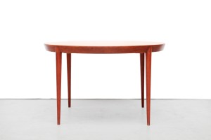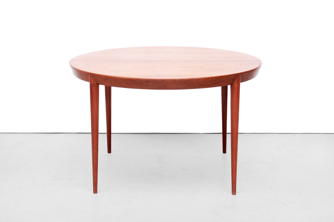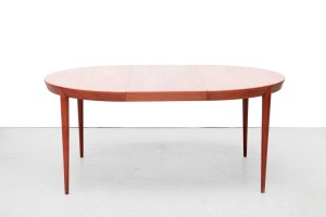 Omschrijving: Deens design eetkamertafel ontworpen door Severin Hansen en geproduceerd door Haslev Mobelfabrik in Denemarken. Prachtig gemaakt met oog voor detail. Uitgevoerd in teak fineer en massief teak houten ronde poten met Severin Hansens kenmerkende driehoek verbinding. Het tafelblad heeft een afgeschuinde rand die naadloos aansluit op elke tafelpoot en is twee maal verlengbaar.