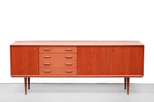 Omschrijving: Lang Deens design dressoir gemaakt van teakhout. Prachtige Deense details waaronder de slanke conische pootjes, het opstaande randje en de massief teak houten greepjes. Bijzonder aan dit dressoir is de lengte van wel 220 cm. Het dressoir is 45 cm diep en 85 cm hoog.