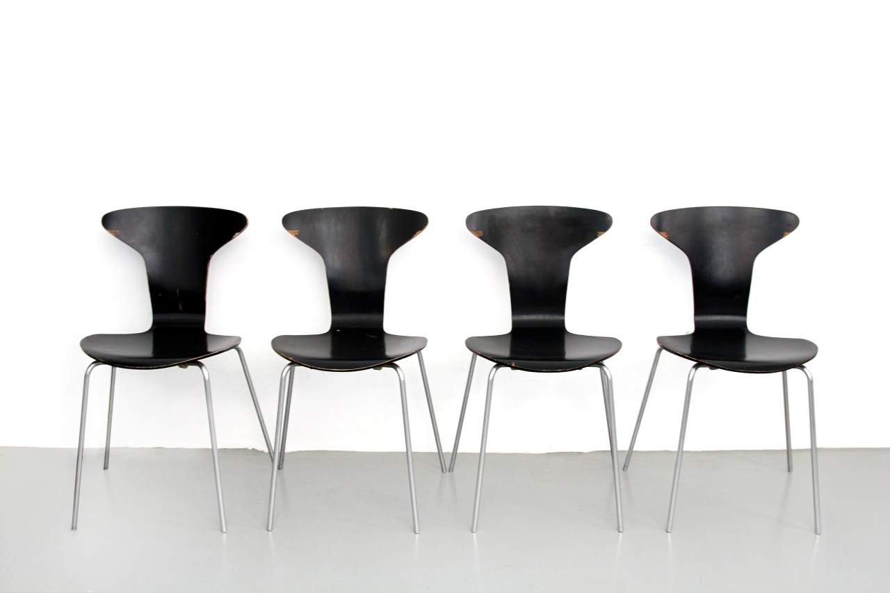 Omschrijving: Set van vier prachtige stoelen ontworpen door Arne Jacobsen voor Fritz Hansen, Denemarken. De officiële naam van de stoelen is ‘stoel 3105’, maar ze worden door hun vorm ook wel ‘de mug’ of ‘mosquito’ genoemd. Deze stoelen zijn van oorsprong ontworpen voor de Munkegaard school, ten noorden van Kopenhagen. Deze set is uitgevoerd in zwart gelakt plywood, ze hebben allemaal het originele metalen kapje aan de onderkant en zijn gemerkt met het jaartal 1963. Echte oudjes dus. De stoelen zijn in totaal 75,5 cm hoog en hebben een zithoogte van 44 cm.