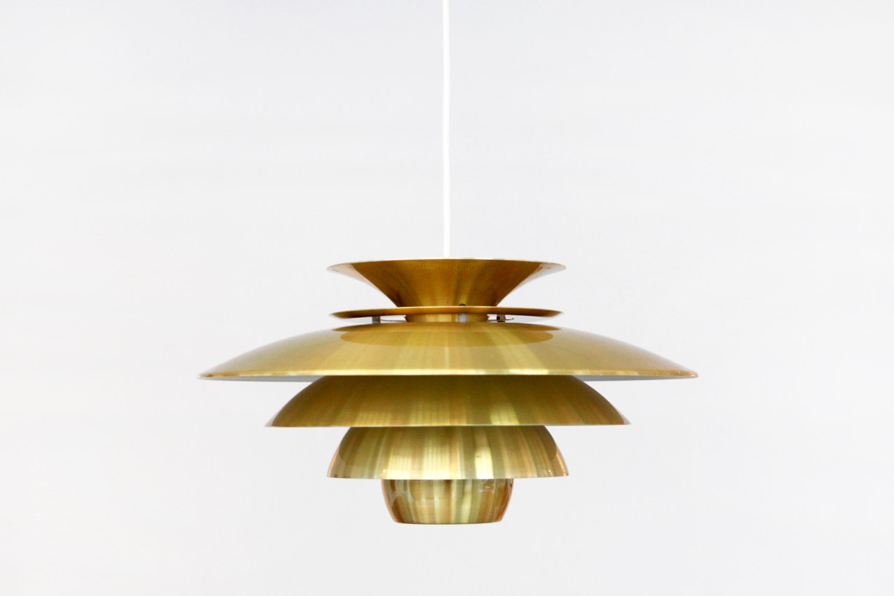 Omschrijving: Mooie vintage messing kleur Deens design hanglamp in de stijl van Poul Henningsen. Dit model is gemaakt van aluminium en heeft een goudkleurige coating waardoor het lijkt op messing. De lamp bestaat uit 5 laagjes en is een mooie alternatief voor een Louis Poulsen.