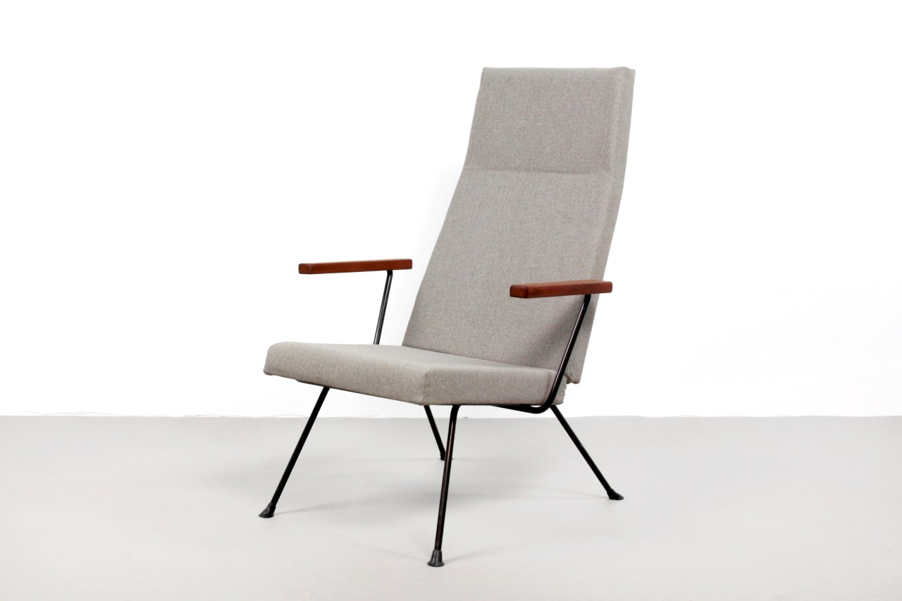 Omschrijving: Deze Nederlands modernistische fauteuil, model 1410, werd ontworpen door André R. Cordemeyer en in 1959 en geproduceerd door Gispen. Het frame is gemaakt van een zwart gelakt stalen buisframe, met teakhouten armleggers en de zitting en rugleuning zijn opnieuw gestoffeerd met een grijs beige wollen stof. De fauteuil is in het bezit van de originele zwarte voetjes die glijden of beschadigingen op de vloer voorkomen. De fauteuil is 101 cm hoog, 63,5 cm breed en 70 cm diep. De zithoogte is 41,5 cm hoog.