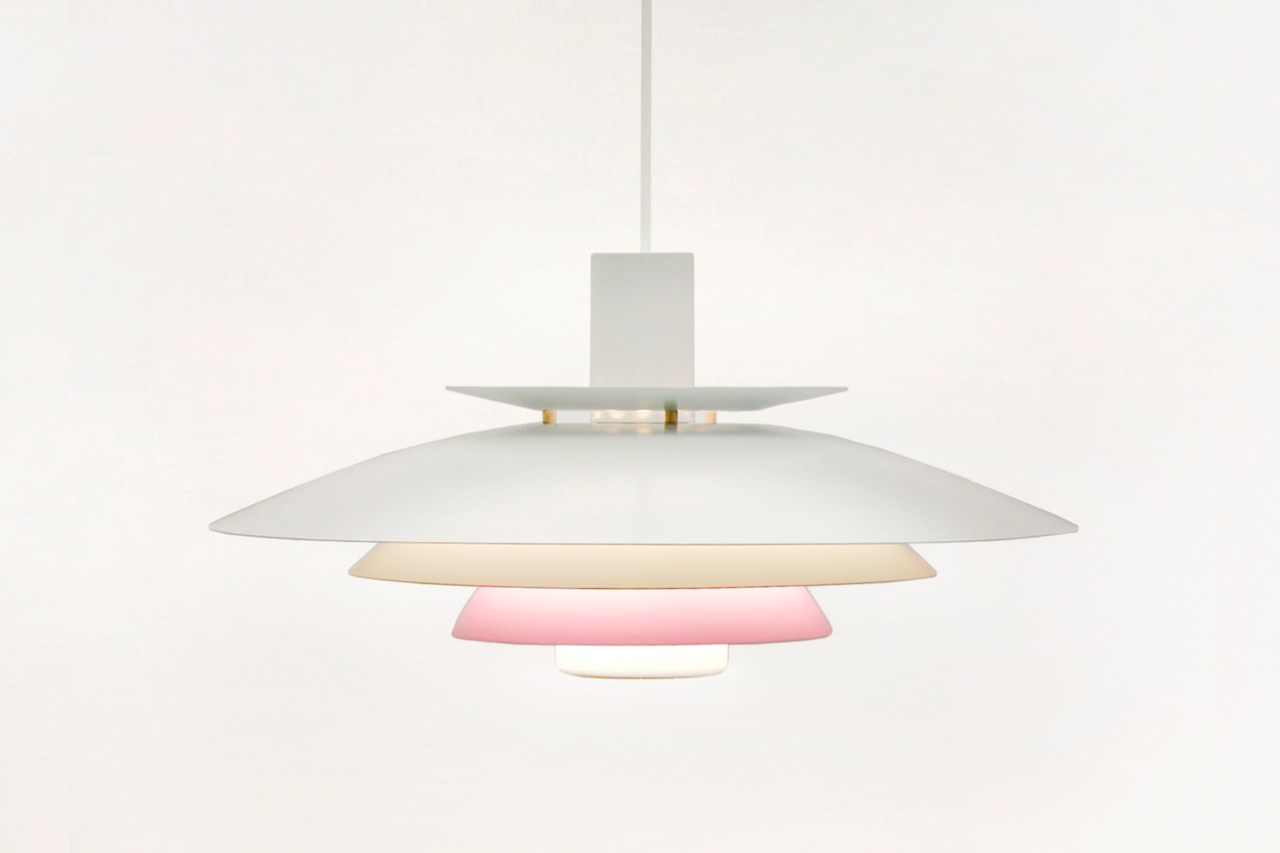 Henningsen en Louis Poulsen. Dit model is van de Deense fabrikant Form light en heeft vijf lagen. De lamp is wit gelakt en is onder een van de ringen paars. Zodra de lamp aanstaat geeft dit een heel leuk effect.