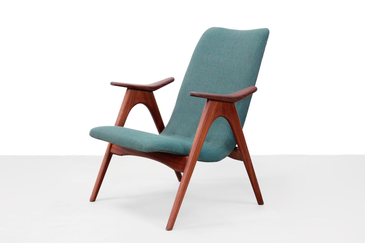 Omschrijving: Mooie design lounge stoel met een frame van massief afro teak hout en nieuw gestoffeerde zitting met donker groene meubel stof. De organische vormgeving van de stoel doet erg Deens aan, maar komt uit Nederland. De fauteuil is toegeschreven aan de Nederlandse ontwerper Louis van Teeffelen voor WeBe, waarbij dit model afkomstig zou zijn uit de A-serie. De totale hoogte van de fauteuil is 79 cm en hij heeft een zithoogte van 38 cm. De stoel is 69 cm breed.