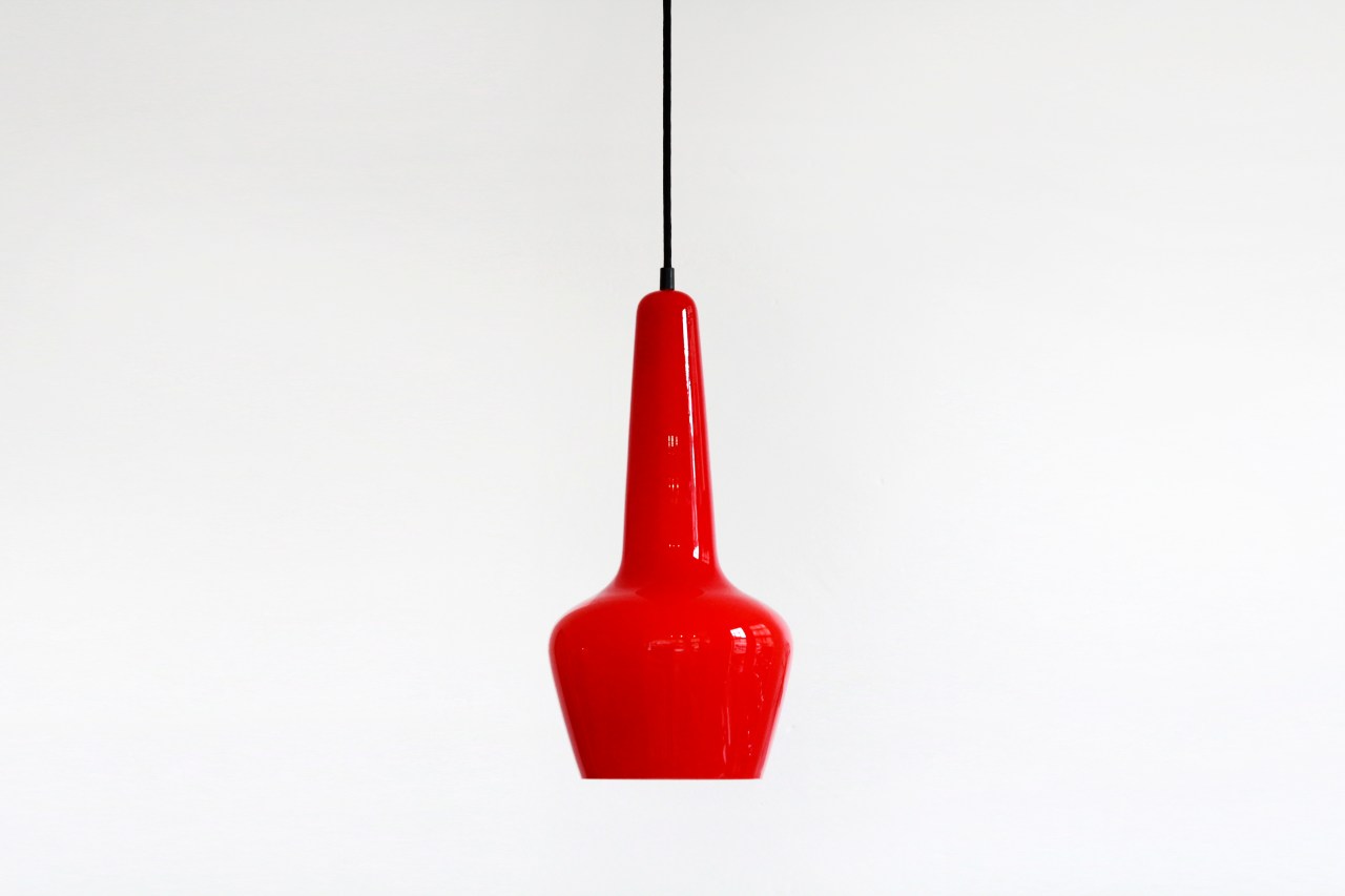 Omschrijving: Mooie rode glazen hanglamp met witte binnenkant, vermoedelijk gemaakt door de Deense glasfabriek Holmegaard. Zowel aan als uit een prachtig object. De druppelvormige pendant geeft mooi sfeerlicht en is daarom uiterst geschikt in een hoek van de kamer, in plaats van een vloerlamp.