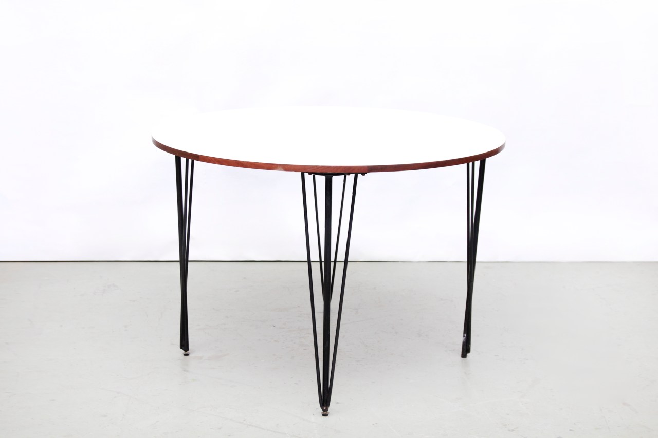 Omschrijving: Ronde eetkamertafel uit de jaren 60 met een houten blad welke aan de bovenkant is afgewerkt met wit formica, en aan de zijkanten met teakhout. De tafel staat op vier zwart metalen pootjes met een in het oog springend ontwerp. De tafel komt uit Nederland en lijkt erg op de ontwerpen van Pastoe. De tafel is helaas niet gemerkt of teruggevonden in de catalogi. De tafel is 112 cm in diameter en 73 cm hoog. De dopjes van de pootjes kunnen uitgedraaid worden om de tafel recht te laten staan op een ondergrond die niet recht is. Dit maakt het ook mogelijk om de tafel iets hoger te stellen dan 73 cm hoogte.