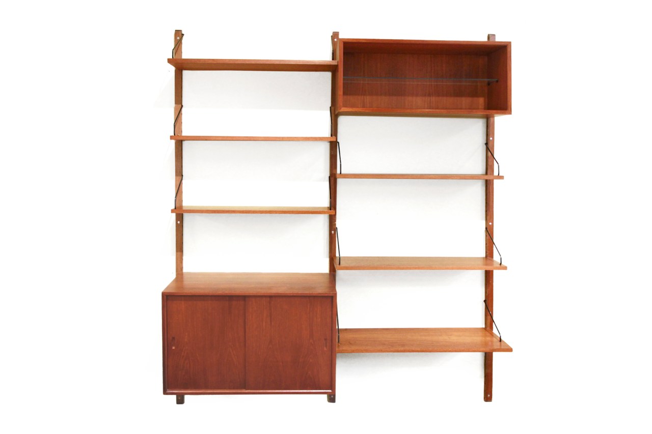 Omschrijving: Teak houten wandsysteem ontworpen door Poul Cadovius en geproduceerd door Royal System Denmark. Deze wandkast bestaat uit 3 houten staanders, 6 planken, een open kastje, en een kastje met twee schuifdeuren. Het is niet alleen een prachtig object in huis, maar ook nog eens heel functioneel. De totale breedte van de kast zoals afgebeeld op de foto is 162 cm breed bij 200 cm hoog.