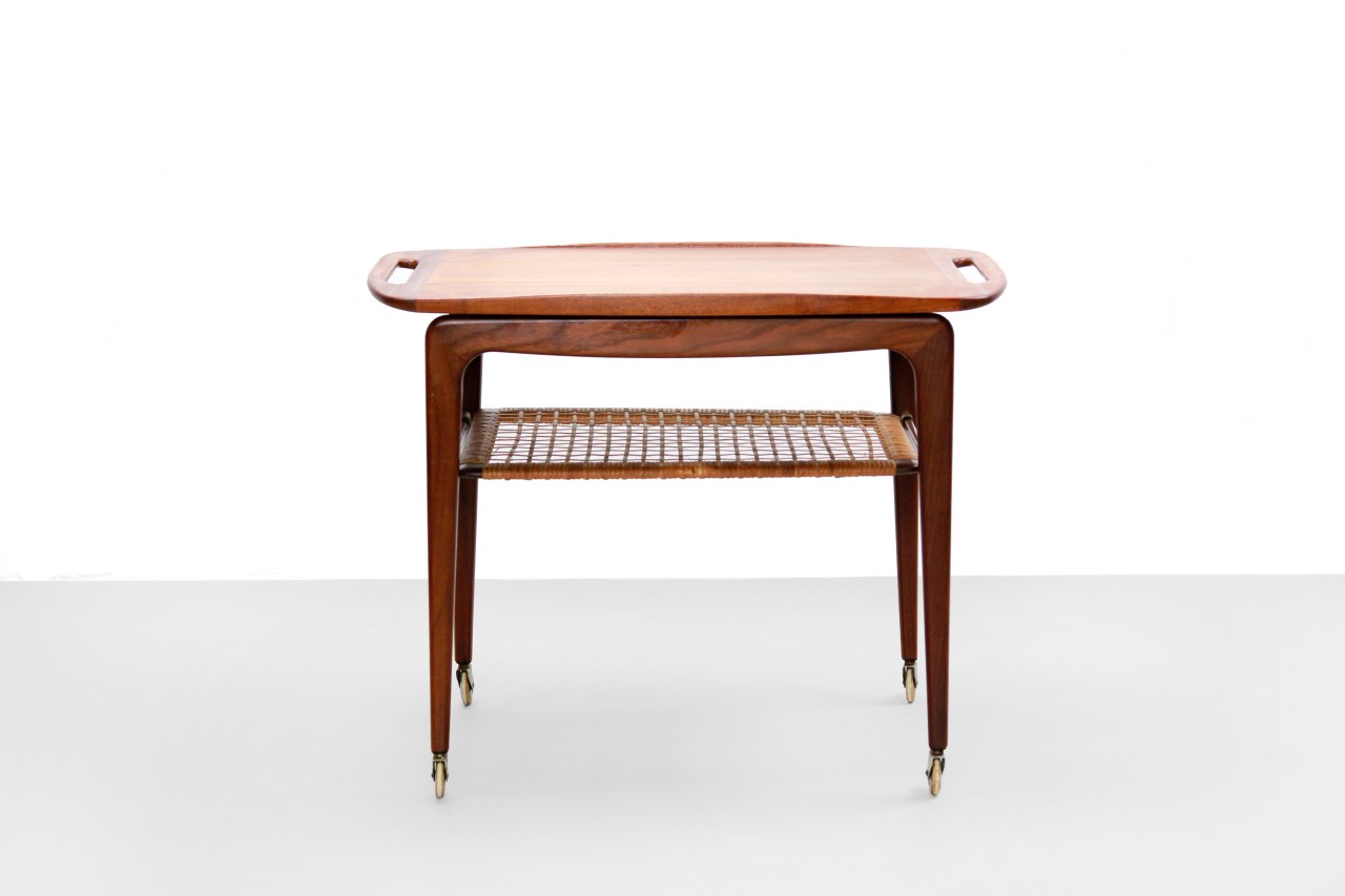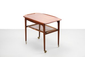 Omschrijving: Deze thee trolley is ontworpen door Johannes Andersen en is grotendeels gemaakt van massief teak van de hoogste kwaliteit. Het blad is te gebruiken als dienblad en door het slimme ontwerp plaats je deze makkelijk terug op het onderstel. De plank onder het dienblad is gemaakt van teak en rotan die hangt aan het onderstel door middel van messing haakjes. Prachtig vakmanschap en een tijdloos ontwerp. Door de wielen onder dit tafeltje is hij super mobiel, maar boven alles is het vooral ook een hele mooie eye-catcher.