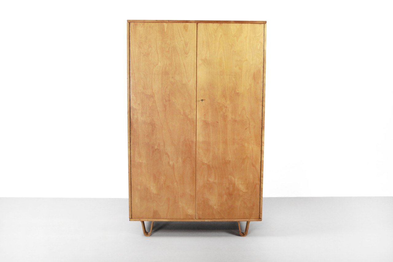 Omschrijving: Zeer mooie wandkast van Cees Braakman voor Pastoe. Dit wandmeubel is afkomstig uit de berkenserie en heeft de welbekende luspoten. De berkenserie is naast de Japanse Serie van Cees Braakman erg gewild. Deze kast is bedoelt als kledingkast, het interieur bestaat dan ook uit een metalen stang om kleding aan op te hangen en een spiegeltje aan de rechterdeur. Deze design klassieker is 170 cm hoog, 104 cm breed en 52 cm diep.