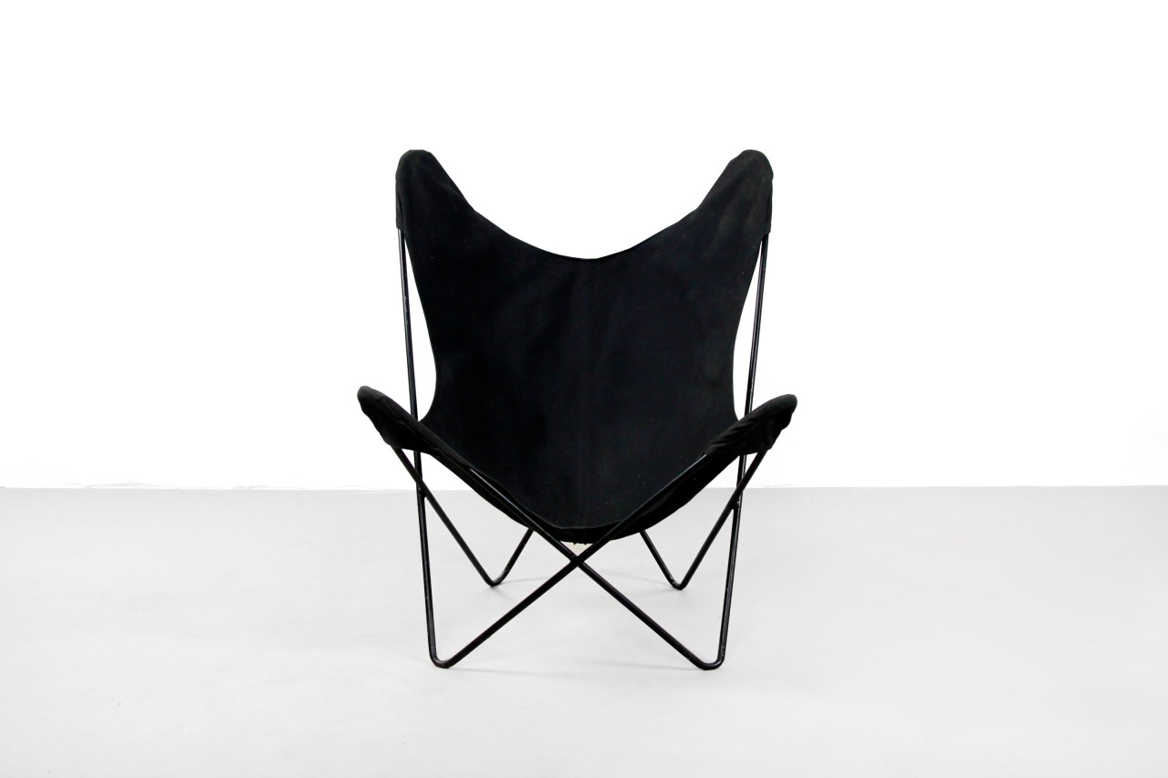 Omschrijving: Misschien wel het meest iconische meubelstuk uit de Mid century modern periode. Deze butterfly fauteuil ontworpen door Jorge Ferrari Hardoy en geproduceerd door Knoll. Oorspronkelijk heet deze fauteuil de Hardoy chair, maar door zijn vormgeving is de stoel door de mensen al gauw naar de Vlinder vernoemd. De stoel is ontworpen in 1938 n.a.v. de in Europa bekende vouwstoel en door onverwachte populariteit door Knoll geproduceerd vanaf 1947 tot 1950. Deze fauteuil heeft een oud frame welke een keer opnieuw zwart geschilderd is en een nieuwe canvas zitting welke niet meer origineel is. Desondanks is deze wel volledig naar origineel ontwerp gemaakt, en kan daarom ook weer jaren gebruikt worden.