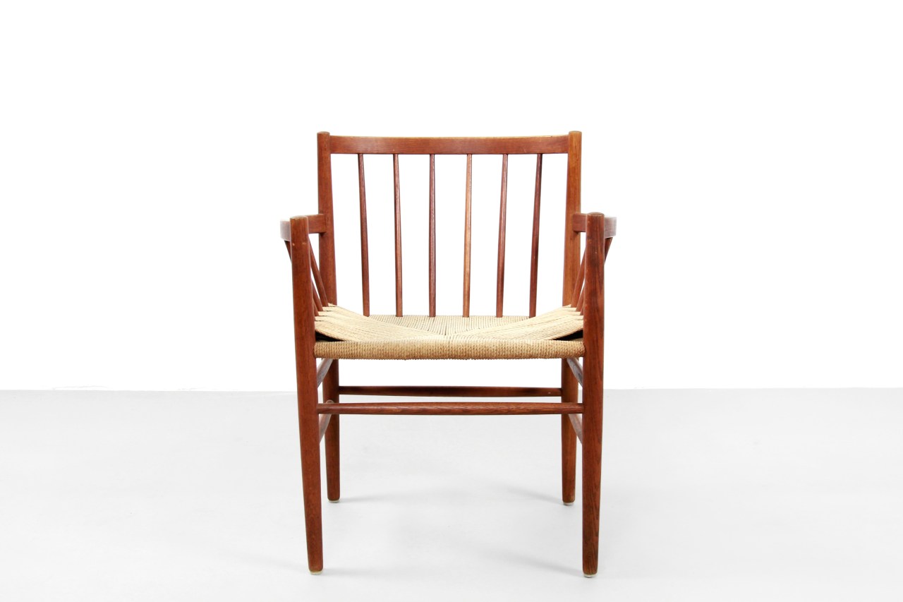 Omschrijving: Prachtige stoel ontworpen door Architect Jorgen Baekmark, welke na Borge Mogensen hoofd was van FDB Mobler. Deze stoel met armleuningen is uiterst geschikt voor aan de eetkamertafel, of aan een bureau, maar kan ook gebruikt worden als hoge fauteuil.