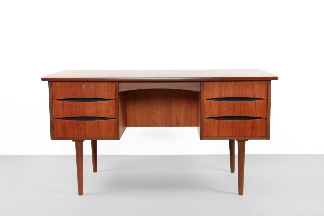 Omschrijving: Stijlvol Deens design bureau gemaakt van teakhout. Dit bureau is multifunctioneel en heeft een prachtige vormgeving. Slanke toelopende pootjes, 6 lades met een vormgeving die ons doen denken aan ontwerpen van Arne Vodder, en een teak gefineerd blad met een lichte ronding. Aan de achterkant van het bureau zijn nog drie vakken te vinden, waaronder een die afgelsoten kan worden, om bijvoorbeeld boeken of verzamelingen op te bergen. Hij kan daardoor ook heel goed midden in de ruimte geplaatst worden. Een bureau en opbergmeubel in een. Het bureau is 138 cm breed, 73 cm hoog en 72 cm diep.