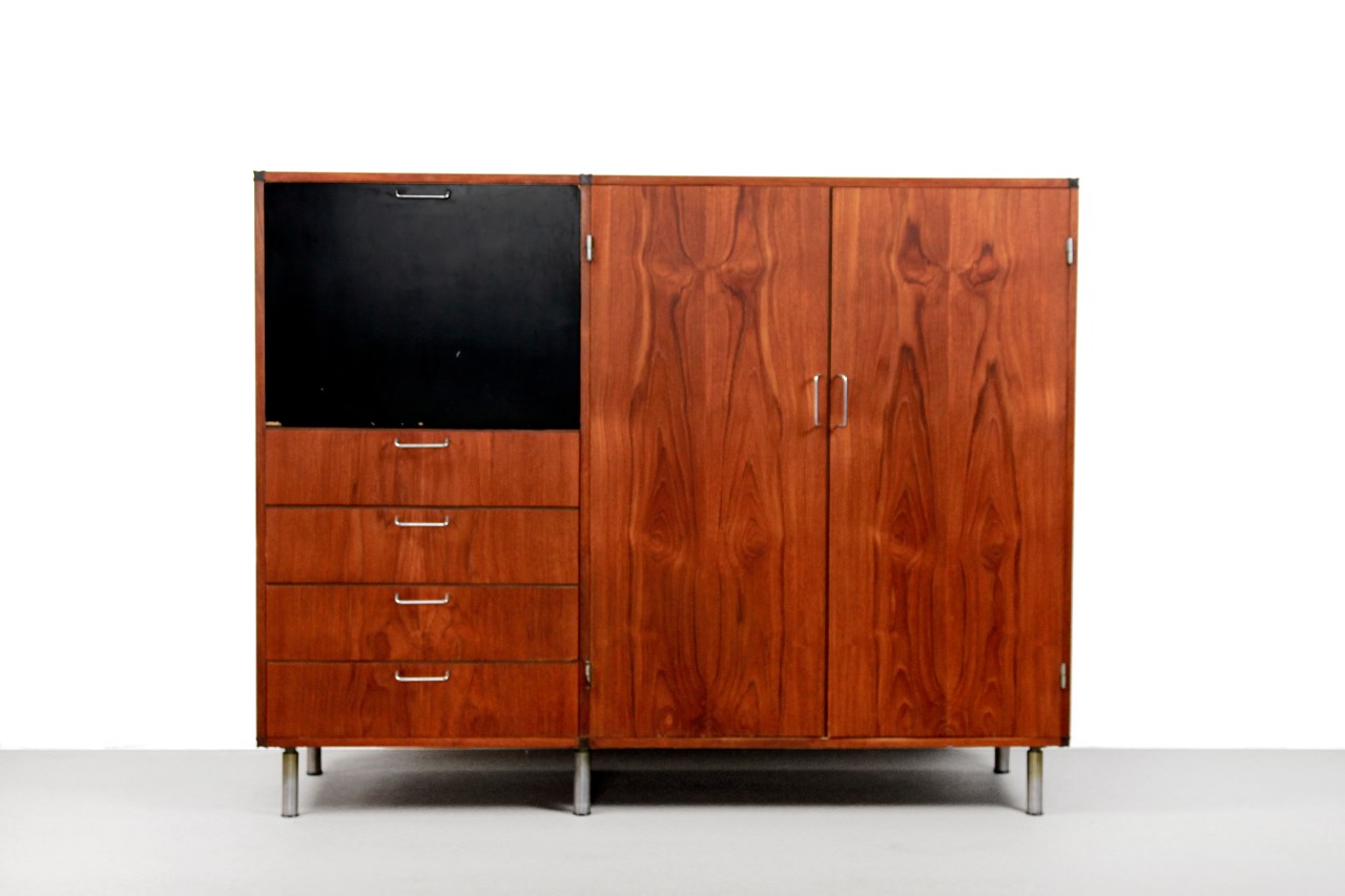 Omschrijving: Stijvolle Pastoe ‘Made to Measure’ kast van Cees Braakman. Deze kast komt uit de ‘Made to Measure’ serie wat betekend dat de kast volledig demontabel was en geheel op maat gemaakt kon worden. Daarnaast verkocht Pastoe ook ‘standaard’ modellen, zoals deze kast. Deze kast bestaat uit twee grote deur met daarachter planken, een zwarte klep die gebruikt kan worden als bureau of bar en vier gebogen plywood lades. Behalve de zwarte klep is alles gemaakt van teakfineer en zijn de pootjes en handgreepjes van geborsteld staal. Deze veelzijdige kast heeft veel opbergruimte en komt daardoor overal van pas. De maten zijn 155 cm breed x 45 cm diep x 123 cm hoog.