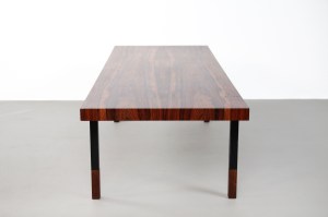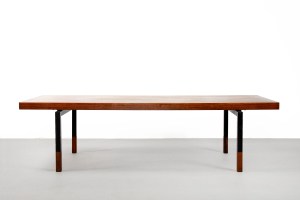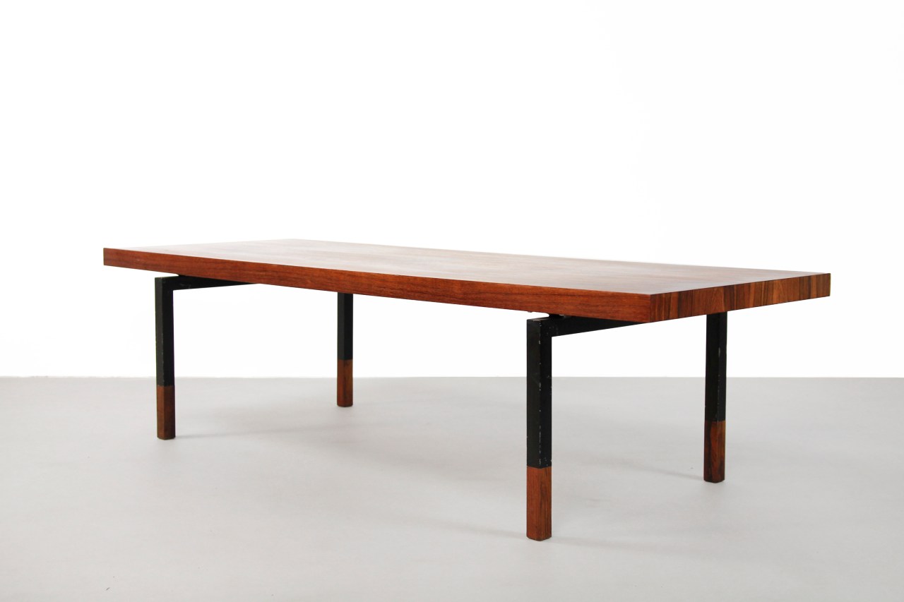 Omschrijving: Stijlvolle Palissander houten salontafel ontworpen door Johannes Aasbjerg en geproduceerd door Illums Bolighus uit Kopenhagen. Deze tafel is gemaakt eind jaren 50 en is ingelegd met prachtig Rio palissander fineer, met een zeer mooie dramatische tekening in het houtnerf wat doorloopt over de randen van de tafel. De zwarte metalen poten hebben een tijdloze moderne uitstraling welke aan de onderkant zijn voorzien van een groot stuk massief palissander hout. De tafel is 165 cm breed, 60,5 cm diep en 45 cm hoog.