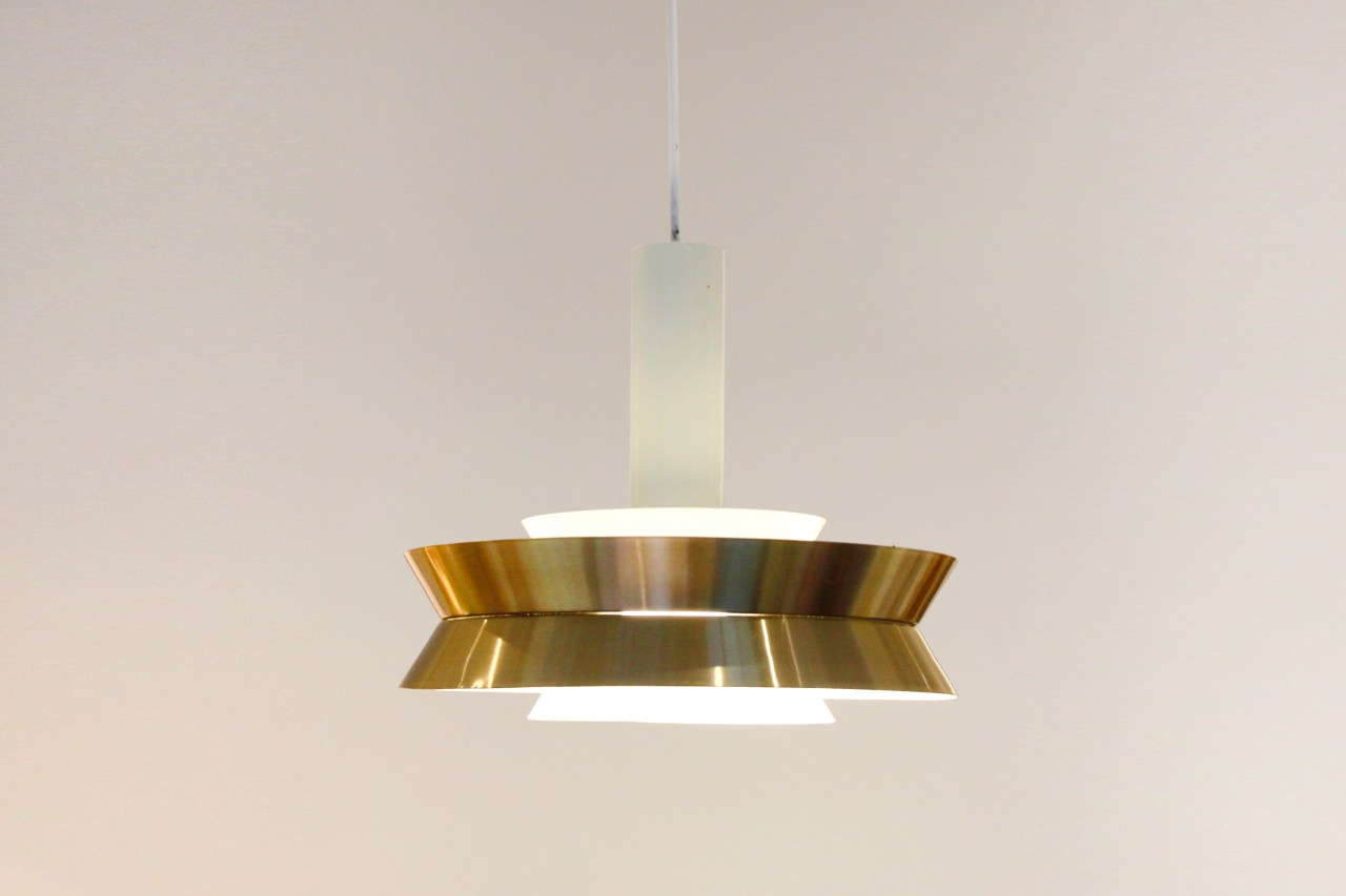 Omschrijving: Prachtige Scandinavische vintage hanglamp van Zweedse designer Carl Thore. De hang lamp bestaat uit goudkleurige aluminium schalen welke aan de binnenkant wit zijn gelakt. Dit model heeft een diameter van 30 cm.
