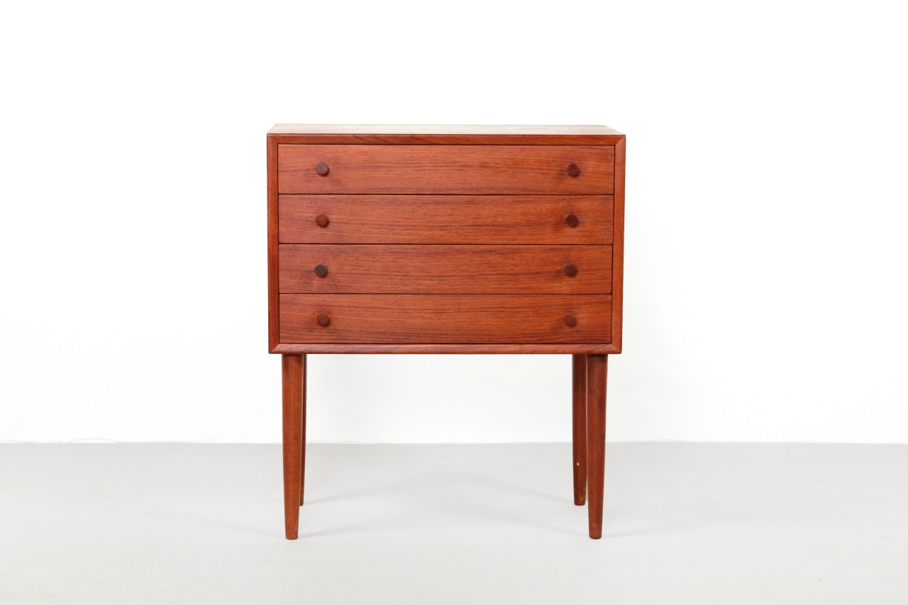 Omschrijving: Leuk teakhouten Deens design kastje met 4 lades en ronde greepjes, op slanke hoge conische pootjes. Dit kastje is uitgevoerd in teak fineer en massief teak houten greepjes en pootjes. Het kastje is goed te gebruiken als nachtkastje, een gangkastje of als extra opbergruimte in de woonkamer, bijvoorbeeld naast de bank. Dit kastje is 58 cm breed, 30,5 cm diep en 68 cm hoog.