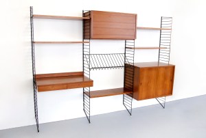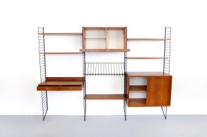 De planken worden opgehangen tussen metalen staanders die op de grond steunen en aan de wand te bevestigen zijn. Het metaal is met zwart plastic overtrokken. De planken zijn van teak hout. De meeste planken zijn gemerkt en bestempeld. Deze set bestaat uit 4 planken van 30 cm diep en 1 smalle plank van 20 cm diep. 4 grond staanders, 1 werkblad met twee lades en een houten opstaande rand, 1 barretje / kastje met glazen plank, 1 kast met twee schuifdeuren en daarachter een plank en een magazine rek. Dit wandrek kan geheel naar eigen inzicht en smaak ingedeeld worden.