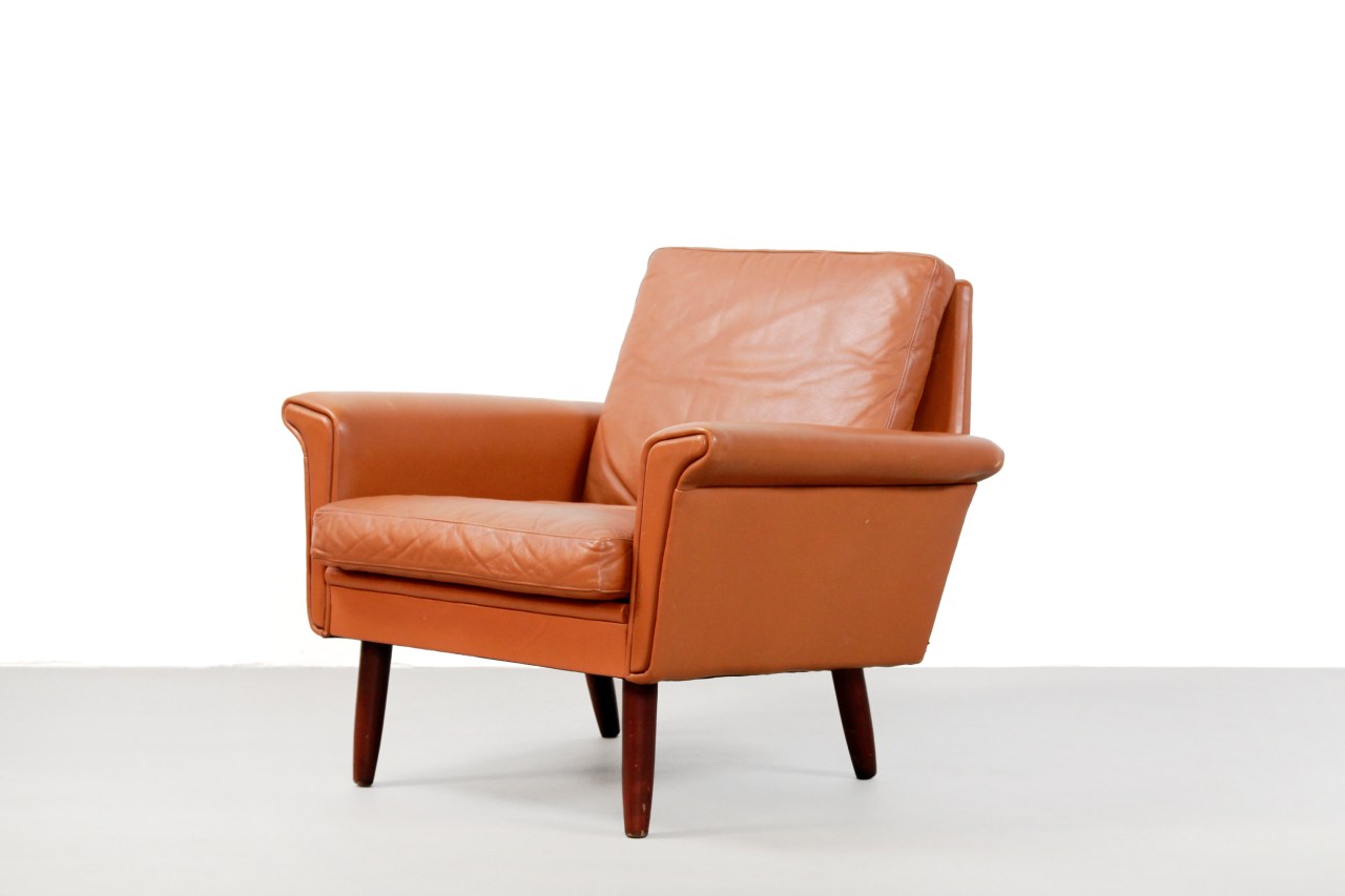 Omschrijving: Cognac kleurige leren Deens design bank uit Denemarken. Deze fauteuil is uitgevoerd in bruin leer met conische houten pootjes. Deze fauteuil heeft een zeer mooie mid century modernistische uitstraling welke als kenmerk heeft dat hij optisch niet veel ruimte inneemt. Deze fauteuil is 70 cm diep, 70 cm hoog en heeft een zithoogte van 40 cm.