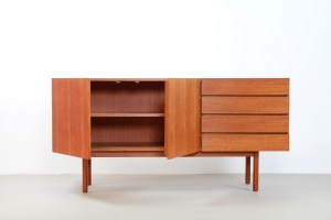 Omschrijving: Strak vormgegeven vintage design dressoir gemaakt van teak. Dit minimalistische dressoir is waarschijnlijk afkomstig uit Nederland of Duitsland en is zo gemaakt dat er geen greepjes nodig zijn. Dit maakt dit model een tijdloos meubelstuk. Het dressoir heeft twee deuren en vier lades en is 168,5 cm breed, 45 cm diep en 82,5 cm hoog.