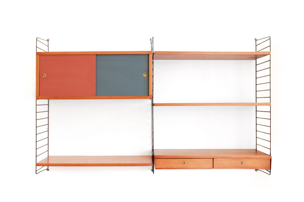 Omschrijving: Mooi String wandrek ontworpen door Nisse Strinning. Wat ooit zijn afstudeerproject was, is nu een gewild item in een modern interieur. De planken zijn uitgevoerd in gefineerd grenen hout en zijn 80 cm breed. Het kastje is een bijzonder stuk met twee originele gekleurde schuifdeurtjes welke ook 80 cm breed en 30 cm diep is. Door het ladenblokje kan dit wandysteem ook zeer goed als bureautje gebruikt worden.