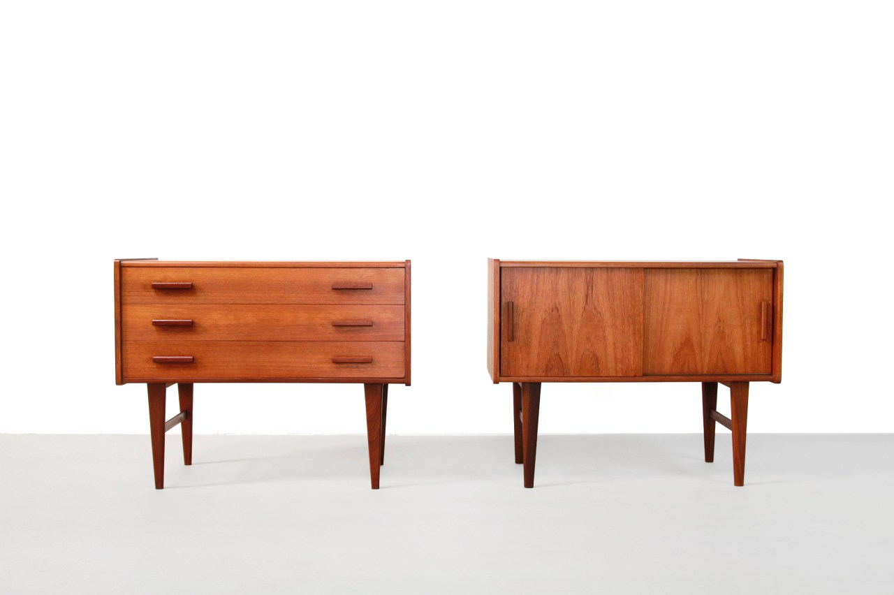 Omschrijving: Mooie set Deens design ladenkastjes waarvan een met 3 lades en een met twee schuifdeuren. Uitgevoerd in teak fineer en strakke rechte teak houten greepjes. Unieke set van twee kastjes die van oorsprong gebruikt werden als nachtkastjes. Afzonderlijk zijn ze natuurlijk ook heel goed te gebruiken als bijvoorbeeld een gangkastje of als extra opbergruimte in de woonkamer. Exact tegen elkaar aan geschoven kunnen ze ook dienen als klein dressoir. De kastjes zijn 80 cm breed, 36 cm diep en 64 cm hoog.