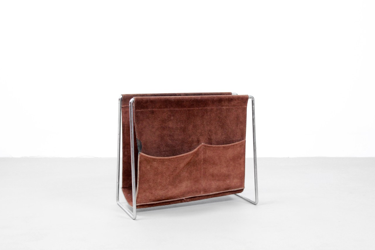 Omschrijving: Mooie bruin leren tijdschriftenhouder ontworpen door Verner Panton en geproduceerd door Fritz Hansen in Denemarken. Deze magazine houder is gemaakt van gebogen chromen buizen met donker bruin ruw leer / suede die tussen het frame hangt. Erg minimalistisch en tijdloos ontwerp. Wij hebben er ook een bachelor chair met armleuningen van Verner Panton bij, wat deze set in combinatie met elkaar een unieke set maakt.