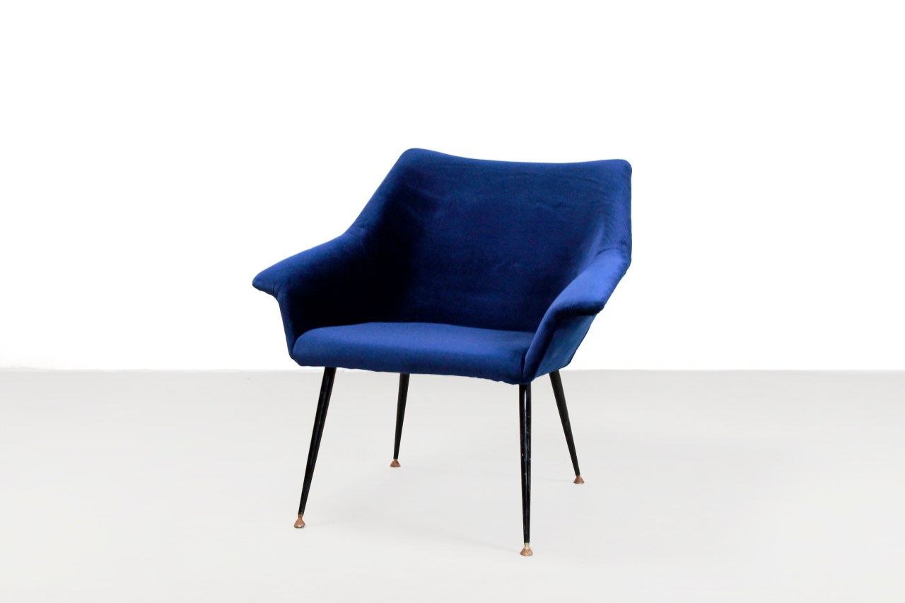 Omschrijving: Zeer mooie comfortabele Italiaanse design fauteuil met donker blauwe velours bekleding en slanke taps toe lopende pootjes. Deze stoel ziet er erg slank uit maar is toch een volwaardige fauteuil en een plaatje om te zien.