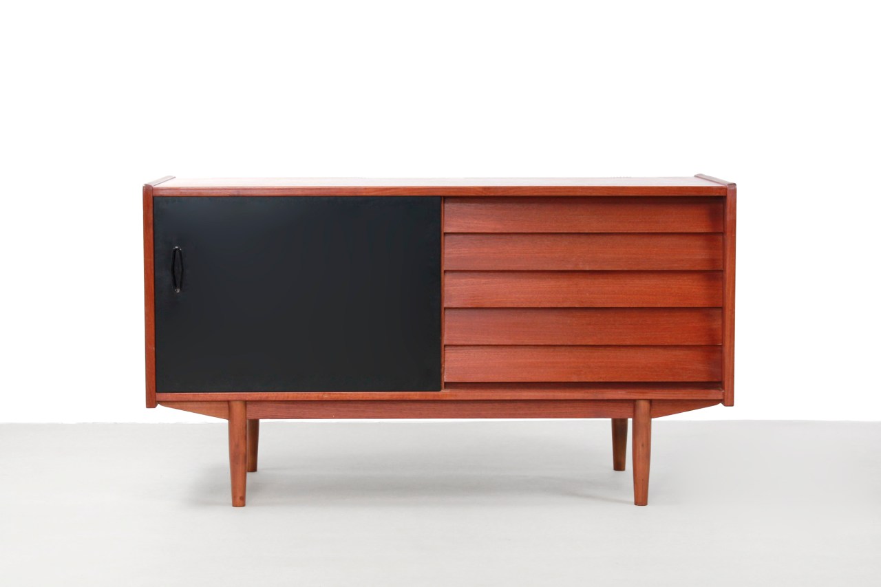 Omschrijving: Zweeds design dressoir ontworpen door Nils Jonsson en geproduceerd door Hugo Troeds Bjarnum. Dit minimalistische dressoir met prachtige vormgeving is afkomstig uit Zweden uit de jaren 60. Het dressoir heeft een origineel zwart gelakte schuifdeur en vijf lades. Deze lades zijn zo mooi trapsgewijs in de kast gemonteerd dat geen handgreepjes meer nodig zijn. Dit dressoir is 128 cm breed, 72 cm hoog en 45 cm diep.
