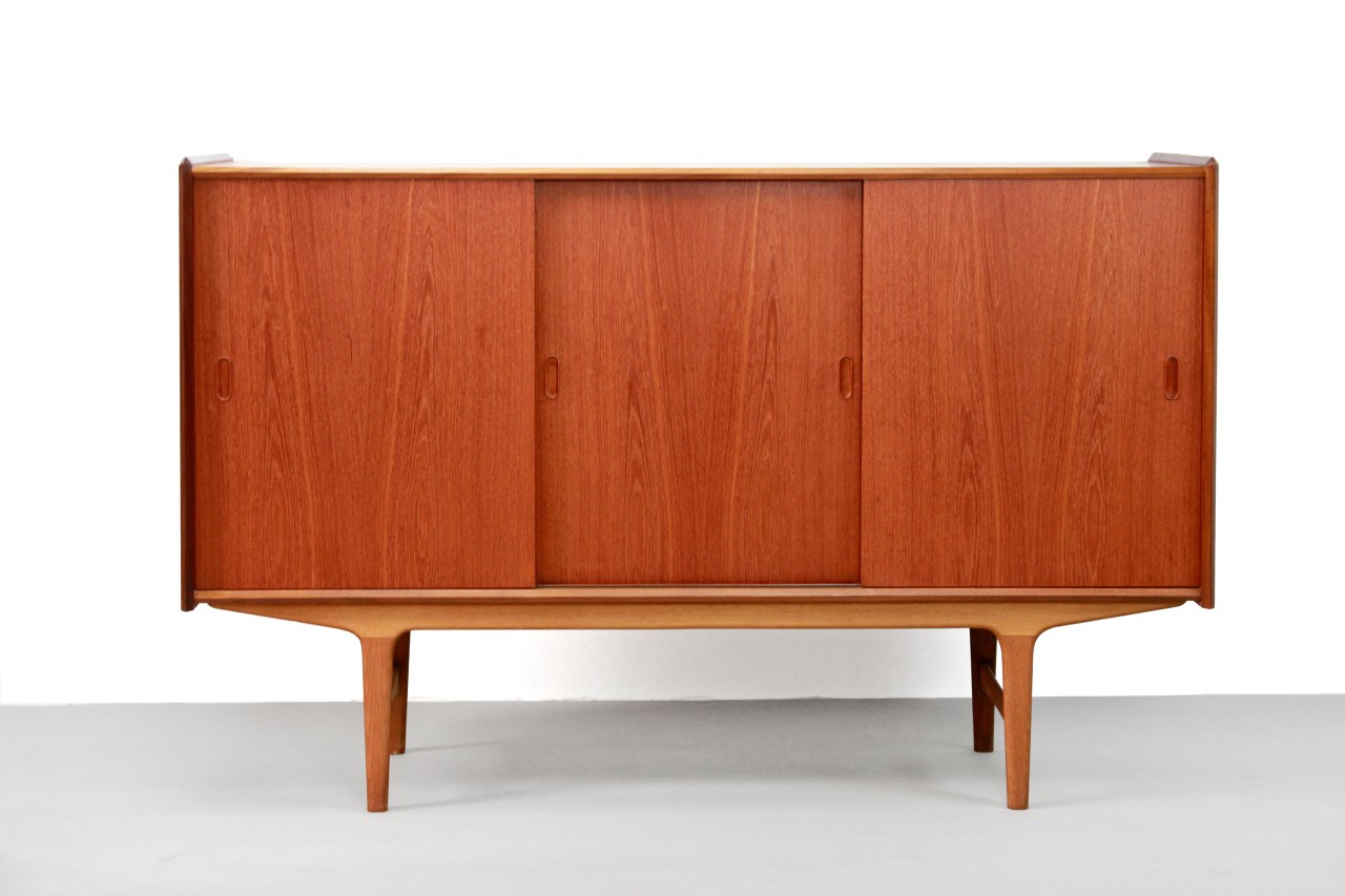 Omschrijving: Zeer mooie teakhouten Deens design highboard. Gemaakt van een combinatie van massief teakhout en teak fineer op een eiken houten onderstel. De kast heeft drie schuifdeuren met achter de eerste deur twee planken, achter de middelste deur een bar met spiegel en vier lades, en achter de laatste deur drie planken. De afmeting van het Deense highboard is 180 cm breed, 46 cm diep en 116 cm hoog.