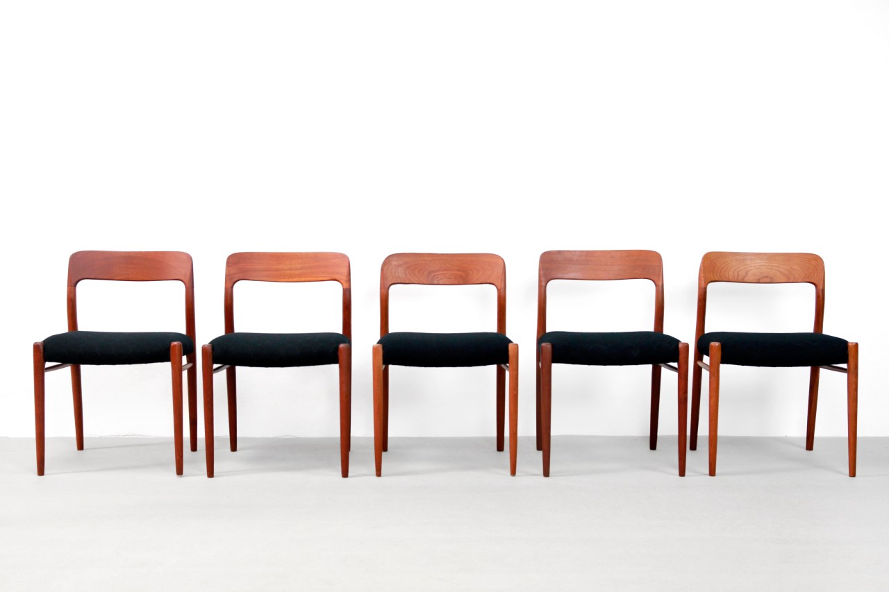 Omschrijving: Erg mooie set van tien eetkamer stoelen ontworpen door Niels Møller. Niels Møller staat in Denemarken bekend voor kwaliteit en vakmanschap en dat is ook goed te zien bij dit model, ‘model 75’. Het massief teakhouten frame is super degelijk en stabiel. De set is opnieuw bekleed in een hoogwaardige meubelstof van Kvadrat, namelijk de Tambourine Hallingdal 198. Deze zwarte stof met geborduurde cirkels geven deze stoelen een klassieke en organische vormgeving.